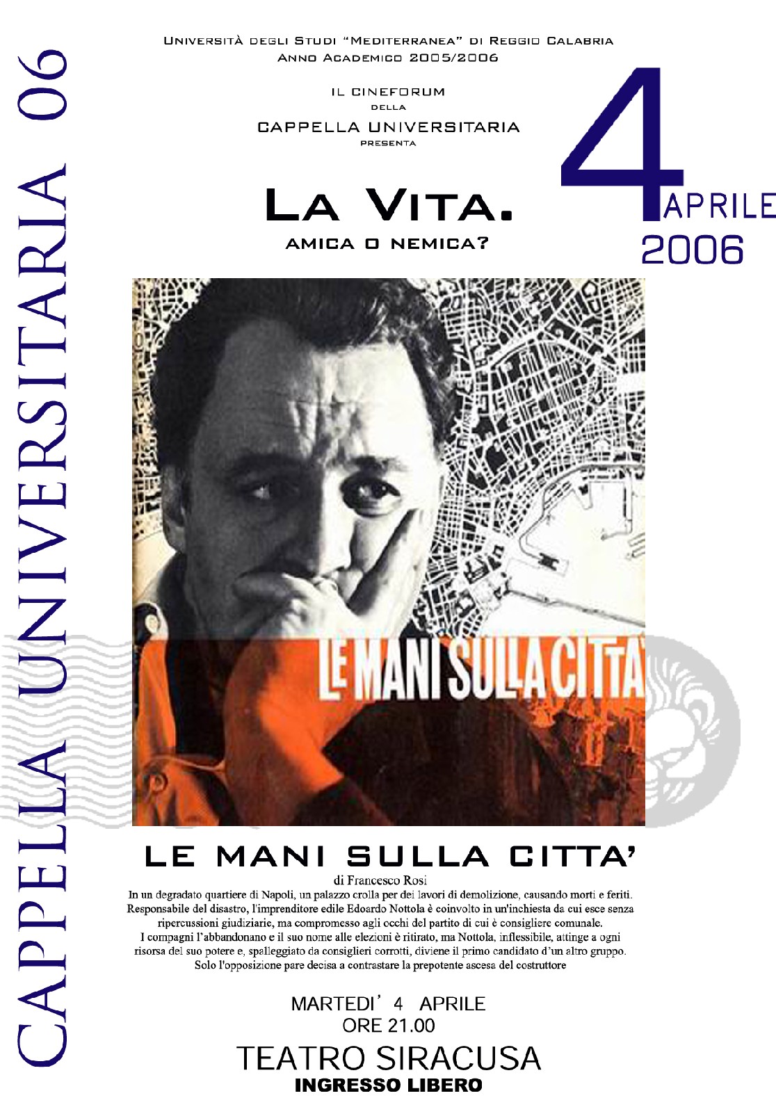 Il CINEFORUM della Cappella universitaria presenta: 04 aprile Le mani sulla città – di Francesco Rosi 09 maggio Saimir – di Francesco Munzi 06 giugno Le invasioni barbariche – di Denys Arcand Teatro Siracusa, ingresso libero