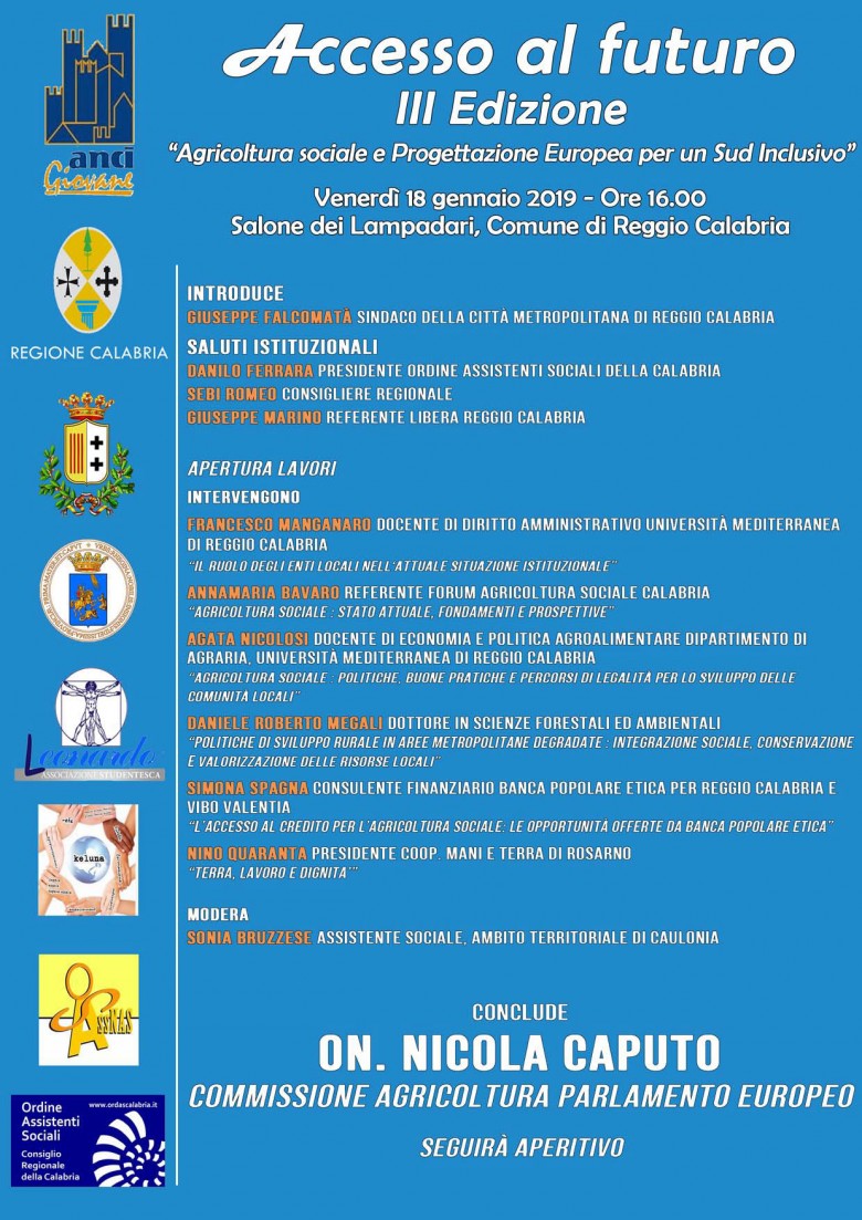 L'associazione Leonardo di concerto con il Comune di Reggio Calabria, la Città Metropolitana di Reggio Calabria, la Regione Calabria e l'Anci Giovani e attraverso l'intesa con Assnas e Keluna organizza in data 18.01.2019 presso il Salone dei Lampadari di Palazzo San Giorgio la Terza Edizione di Accesso al Futuro: Agricoltura Sociale e Progettazione Europea per un Sud Inclusivo.