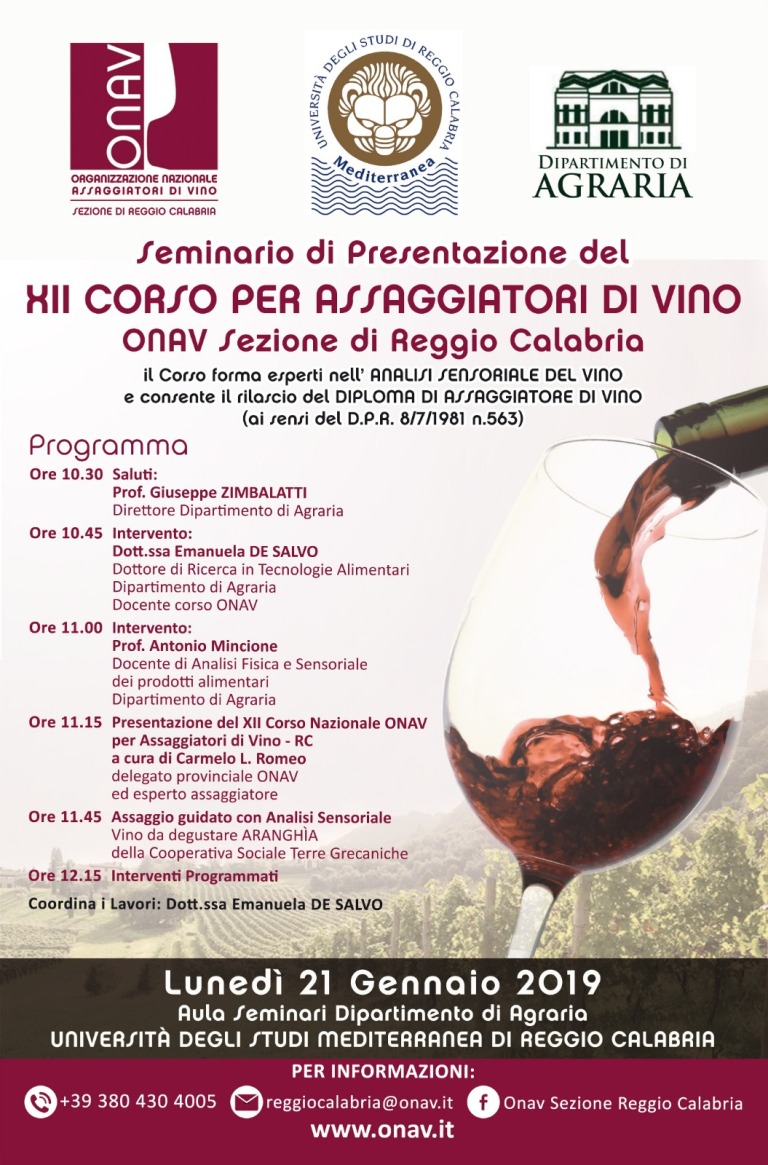 Si invitano gli studenti e tutti gli appassionati di enologia ed analisi sensoriale a partecipare alla presentazione ufficiale del XII Corso ONAV per Assaggiatori di Vino della citta’ di Reggio Calabria” che avrà luogo nella giornata di lunedì 21 Gennaio dalle ore 10,30 presso l’Aula Seminari del Dipartimento di Agraria dell’Università Mediterranea di Reggio Calabria, allo scopo di prendere coscienza del percorso formativo che porterà al rilascio della Patente di Assaggiatore di Vino