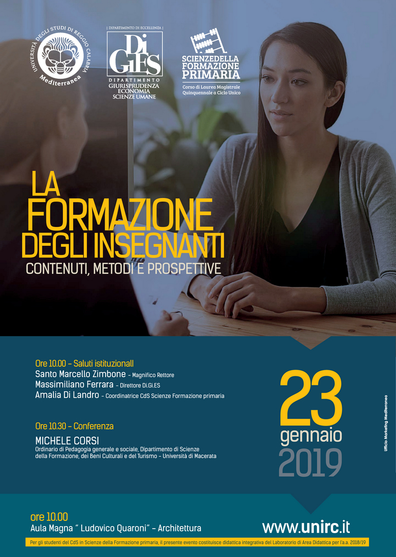 Mercoledì 23 gennaio 2019 alle ore 10.00, presso l’Aula Magna di Architettura “Ludovico Quaroni”, il Dipartimento di Giurisprudenza, Economia e Scienze Umane ha ospitato il prof. Michele Corsi che ha tenuto una lezione su “La formazione degli insegnanti. Contenuti, metodi e prospettive”.