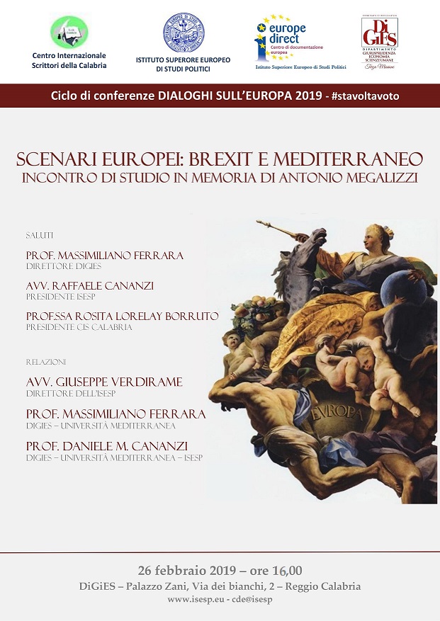 Il ciclo di Conferenze 'Dialoghi sull'Europa 2019', organizzato in collaborazione col DiGiES dell'Università Mediterranea e col CIS Calabria, prosegue con la conferenza Scenari europei: Brexit e Mediterraneo. Incontro di studio in memoria di Antonio Megalizzi".