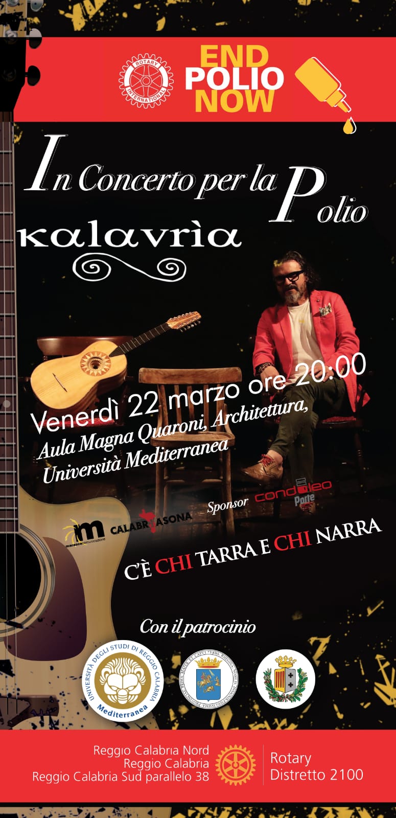I Club Rotary di Reggio Calabria hanno organizzato un concerto presso l’Aula Magna Quaroni di Architettura venerdì 22 marzo 2019 alle ore 20.00, con lo scopo di raccogliere fondi da destinare al Progetto Rotary “Polio Plus”. Il Concerto sarà realizzato dai Kalavrìa, un gruppo che sostiene e porta in giro con successo i valori della cultura popolare Calabrese nel mondo.