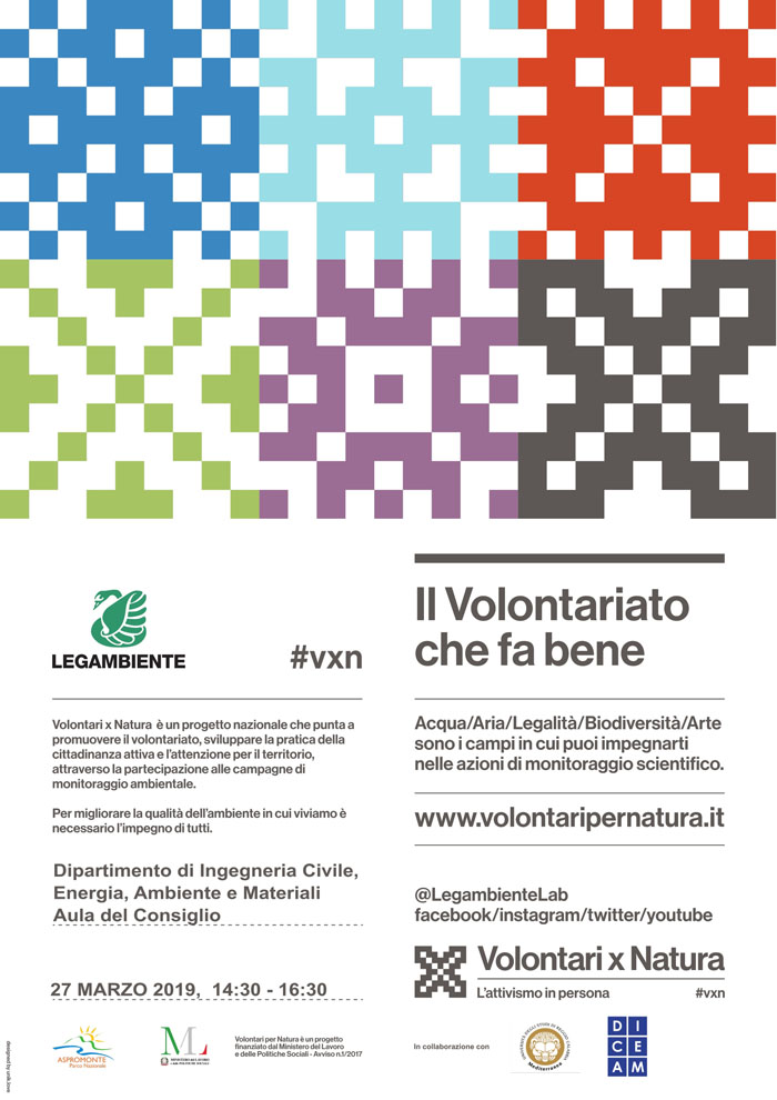 il Dipartimento di Ingegneria Civile, Energia, Ambiente e Materiali (DICEAM) aderisce all’iniziativa “Volontari x Natura” promuovendo un seminario mercoledì 27 marzo dalle ore 14.30 alle 16.00 presso Aula del Consiglio. La partecipazione al seminario è libera e non necessità di registrazione.
