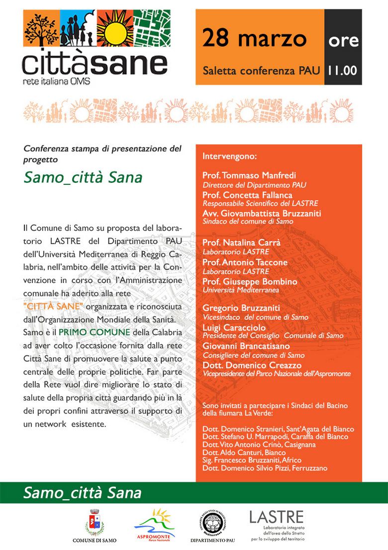 Il Comune di Samo su proposta del laboratorio LASTRE del Dipartimento PAU dell’Università Mediterranea di Reggio Calabria, nell’ambito delle attività per la Convenzione in corso con l’Amministrazione comunale ha aderito alla rete "Città Sane" organizzata e riconosciuta dall'Organizzazione Mondiale della Sanità.