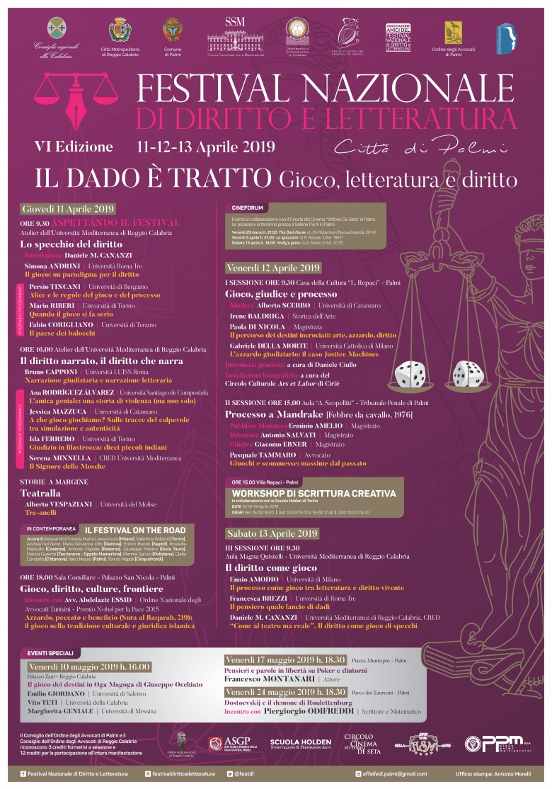 Giunto alla sesta edizione il Festival Nazionale di Diritto e Letteratura si presenta all'appuntamento con un programma molto ricco e con un tema affascinante: "Il dado è tratto. Gioco, letteratura e diritto". Reggio Calabria-Palmi 11, 12, 13 aprile.