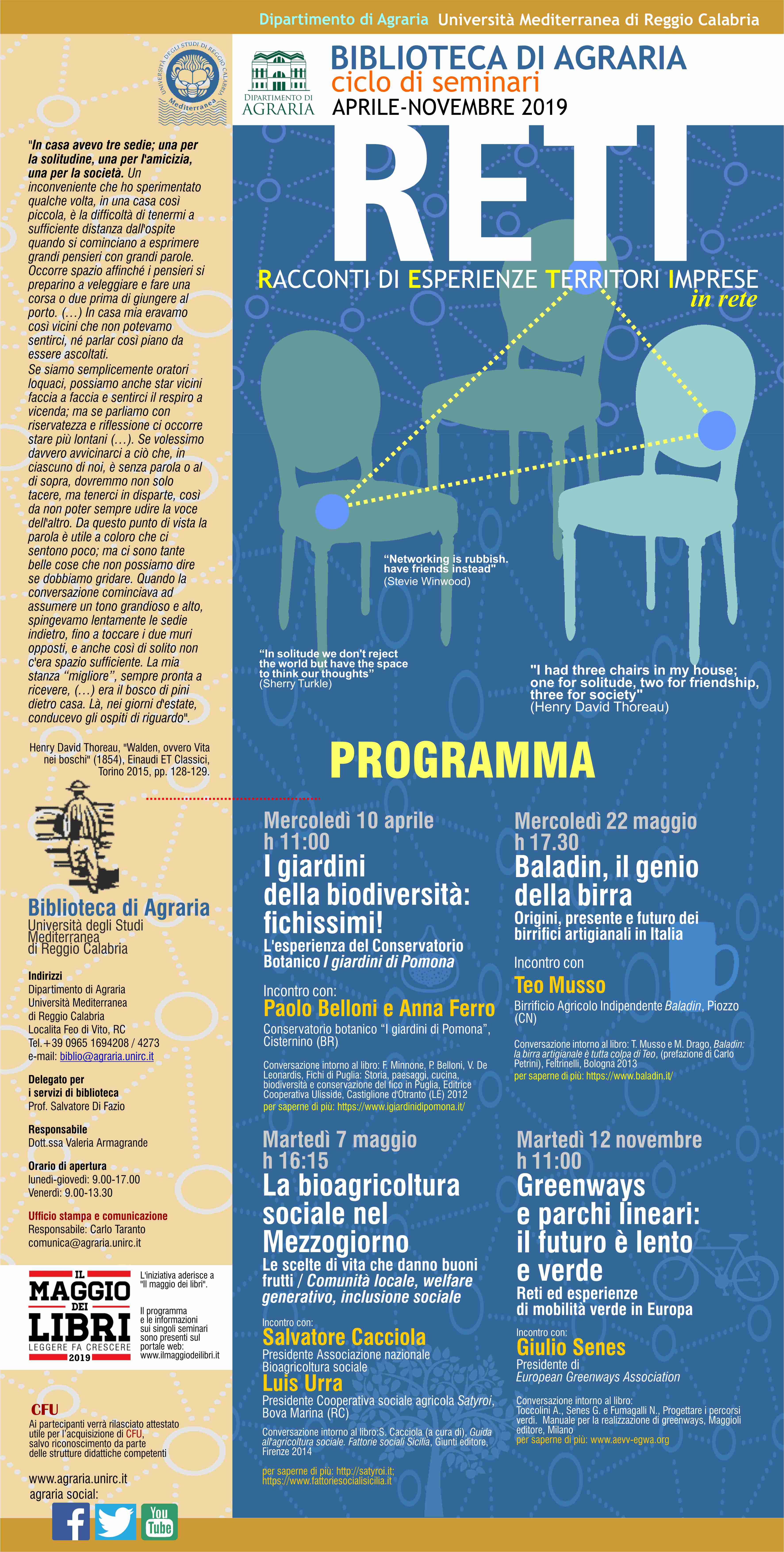 La Biblioteca del Dipartimento di Agraria dell’Università Mediterranea di Reggio Calabria promuove un ciclo di seminari dal titolo “RETI: Racconti di Esperienze, Territori, Imprese” che si svolgerà dal 10 aprile al 12 novembre 2019. L’iniziativa partecipa alla campagna nazionale “Il maggio dei libri 2019” e prevede la presentazione di volumi collegati da un comune filo tematico, attraverso l’incontro con gli autori. Il ciclo di quest’anno si articola in quattro seminari nei quali verranno presentate esperienze che nel mondo rurale (e non solo), a partire dalla condivisione di un chiaro orizzonte etico, stabiliscono trame di relazioni che vanno ben oltre il semplice networking, contribuendo a costruire spazi vivibili, innovando le espressioni del lavoro e offrendo esempi concreti di socialità rinnovata.