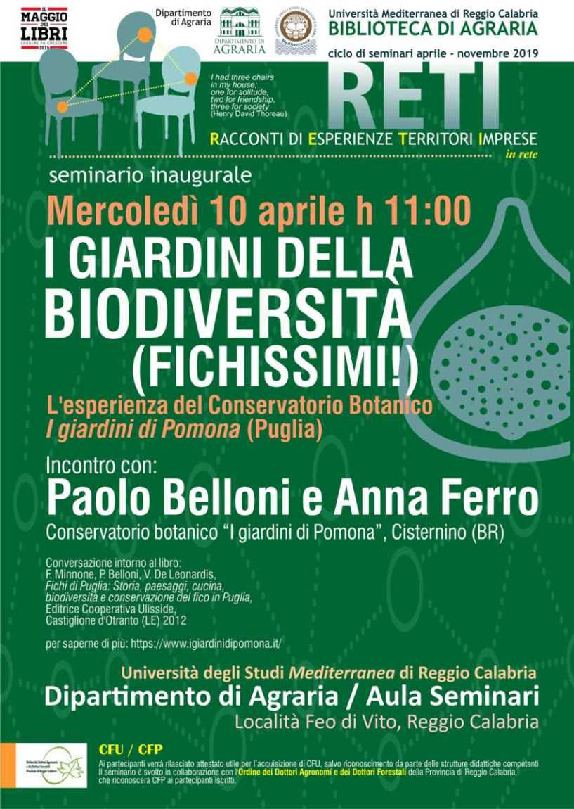 Mercoledì 10 Aprile alle ore 11 si inaugura il ciclo di seminari 2019 promosso dalla Biblioteca del Dipartimento di Agraria dell’Università Mediterranea di Reggio Calabria, avente per titolo “RETI: Racconti di Esperienze, Territori, Imprese”. Paolo Belloni e Anna Ferro svilupperanno il tema “I giardini della biodiversità: fichissimi!” raccontando l’esperienza del Conservatorio Botanico “I giardini di Pomona”, da loro fondato a Cisternino, Puglia. Qui la biodiversità frutticola è rappresentata da oltre mille varietà di piante da frutto antiche provenienti da tutto il mondo, molte delle quali sono state salvate dall’estinzione. Tra esse, il cachi di Nagasaki, figlio di una piantina scampata alla bomba atomica esplosa sulla città giapponese nel 1945 e ritrovata fra le macerie. I dieci ettari del Conservatorio, condotti con metodo biologico, si trovano in un contesto paesaggistico affascinante. Le collezioni, di grande interesse scientifico e con accurate sistemazioni, riguardano una grande varietà di specie frutticole quali melograni, peri, meli, agrumi. La collezione principale è dedicata alla specie Ficus carica: 600 tra fichi afgani, bosniaci, francesi, portoghesi, albanesi, israeliani, italiani… che stanno in pacifica convivenza fra loro. Si tratta di una collezione fra le più importanti d’Europa e del bacino del Mediterraneo, per qualità e varietà. L’esperienza di Paolo Belloni e Anna Ferro interessa inoltre la valorizzazione della cultura, delle tradizioni e delle identità territoriali della valle d’Itria, con il recupero dei metodi di trasformazione e conservazione dei prodotti, dei segni territoriali e delle componenti del paesaggio (muri a secco, trulli, masserie) e con la proposta di esperienze didattiche e di turismo sostenibile, in connessione con le reti regionali dell’escursionismo e del ciclo-turismo.