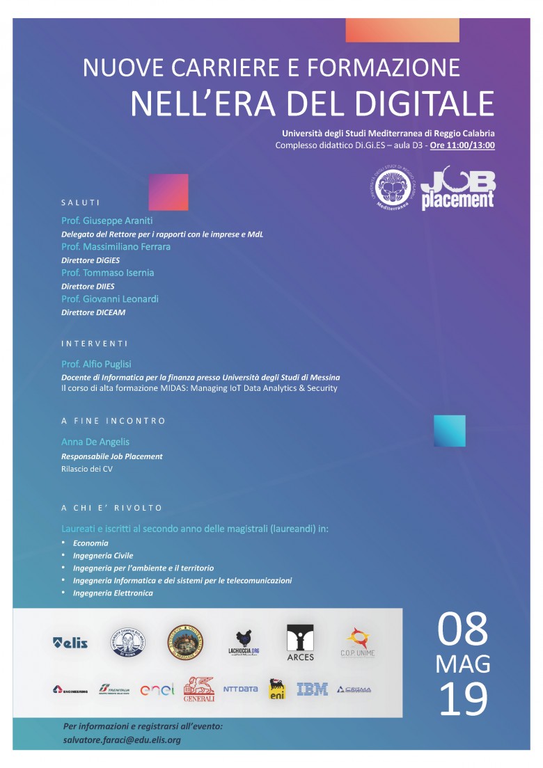 Mercoledì 8 maggio alle ore 11.00 in Aula D3 - Complesso didattico Di.Gi.ES il Job Placement dell’Università Mediterranea invita i laureati e gli iscritti al secondo anno delle magistrali in:
