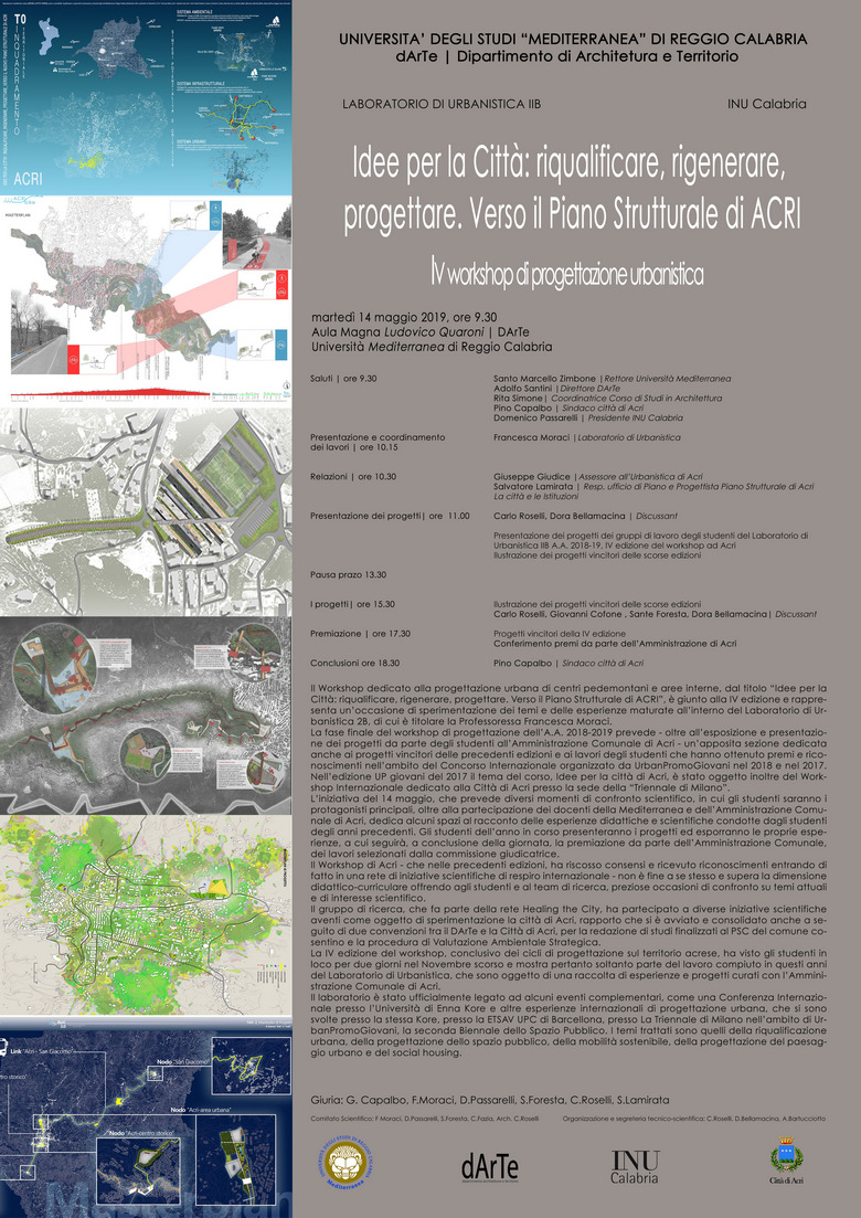 Il 14 maggio 2019 alle ore 9.30 presso l’Aula Magna Ludovico Quaroni di Architettura, si terrà il quarto workshop di Progettazione Urbanistica sulla città di Acri e l’esposizione dei lavori del Laboratorio di Urbanistica 2B A.A. 2018/19 e dei lavori vincitori di premi negli anni passati.
