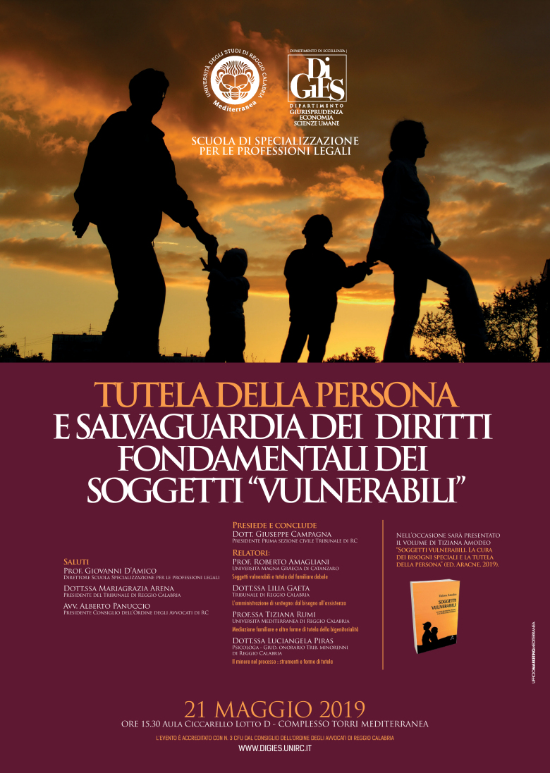 Il 21 maggio alle ore 15:30, si svolgerà nell’Aula Ciccarello del DiGiES l'incontro di studio promosso dalla Scuola di Specializzazione per le Professioni Legali e dall’Osservatorio sul diritto di famiglia del Tribunale di Reggio Calabria, nel corso del quale avrà luogo anche la presentazione del volume di Tiziana Amodeo su “Soggetti vulnerabili. La cura dei bisogni speciali e la tutela della persona”, recentemente pubblicato dalla casa editrice Aracne.