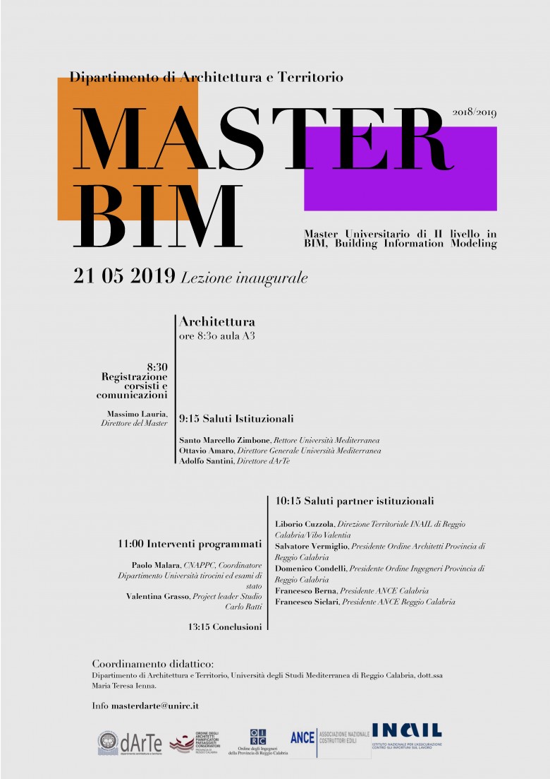 Il 21 maggio ore 8.30, in aula A3 di Architettura, avrà luogo la lezione inaugurale del Master universitario di II livello in BIM Building Information Modeling, attivato, per l’anno accademico 2018/2019, dal Dipartimento di Architettura e Territorio (dArTe).