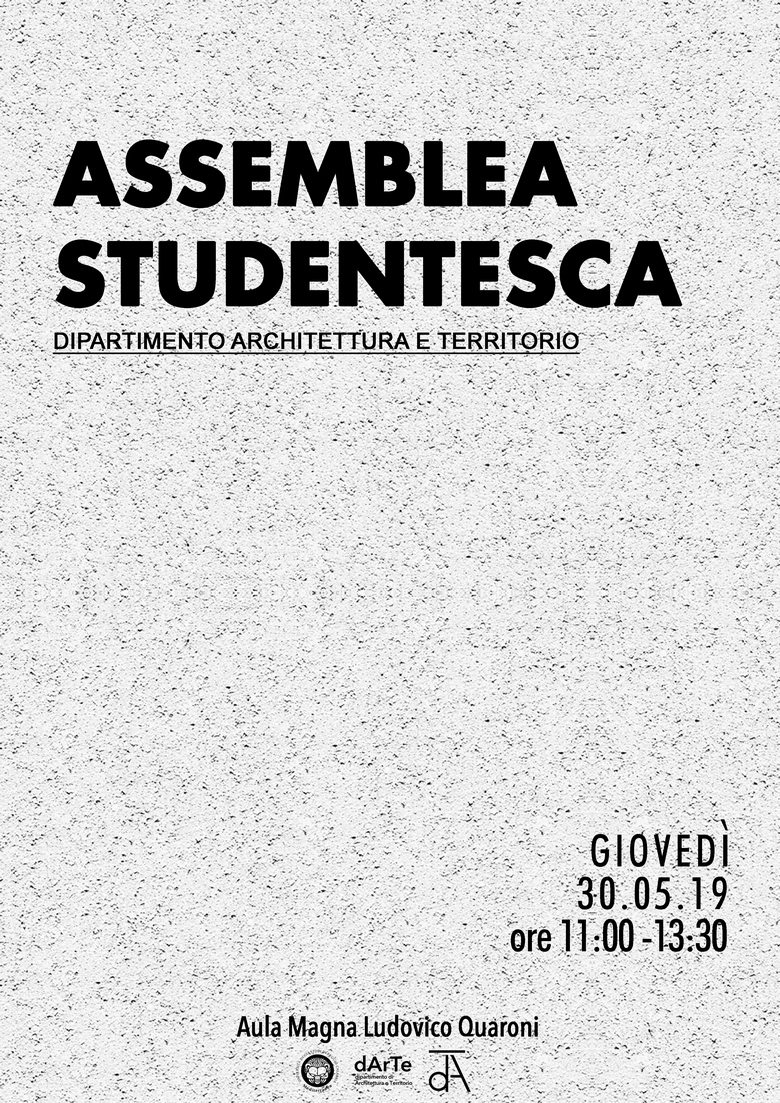 I rappresentanti degli studenti del Dipartimento dArTe indicono un'assemblea studentesca per giovedì 30 maggio 2019 dalle ore 11:00 alle ore 13:30 in Aula Magna Ludovico Quaroni.