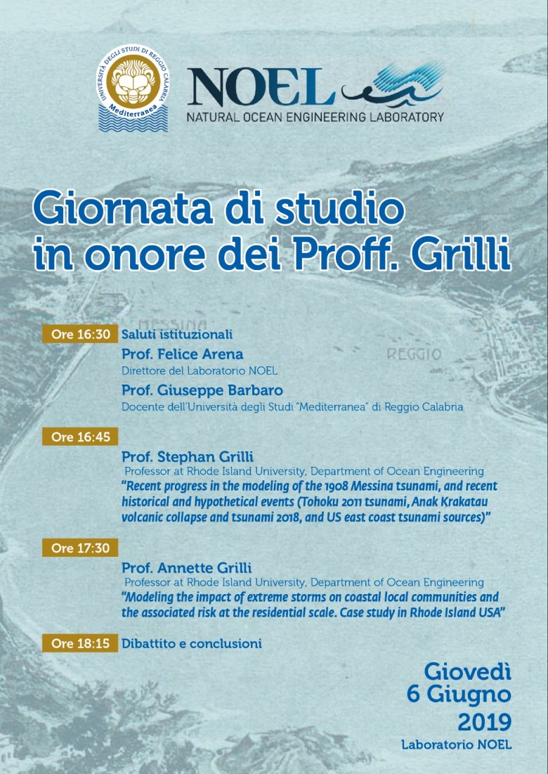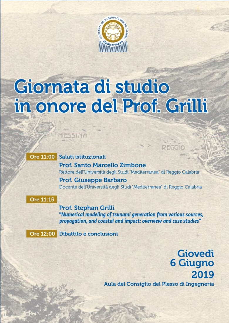 Il prof Grilli, che si distingue a livello internazionale per la sua ricerca nel campo della generazione e propagazione dell’onda di tsunami, l’impatto sulle coste nonché l’analisi di rischio, si è recentemente occupato dello studio del maremoto sullo Stretto di Messina del 1908, insieme con il prof Giuseppe Barbaro del DICEAM, nell’ambito della tesi di ricerca dell’ing. Maria Donatella Gangemi, che ha conseguito il titolo di dottore in ricerca nel corso del XXIX ciclo di dottorato in “Ingegneria idraulica, costruzioni idrauliche e marittime, idrologia e energia dalle acque”.