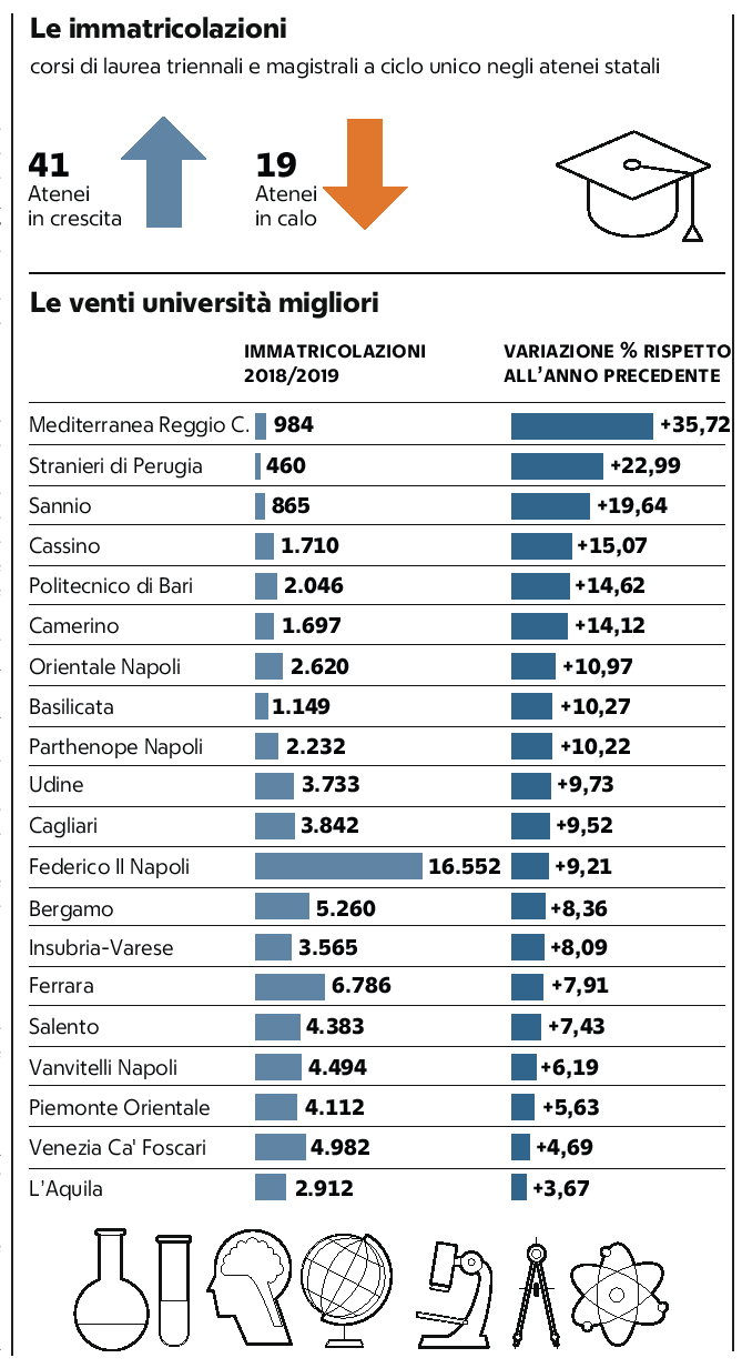 Nel confronto sull'andamento delle immatricolazioni, a cura di Ilaria Venturi e Corrado Zunino, l'Università Mediterranea si colloca al primo posto, con un'aumento del 35% rispetto al 2017/2018, per un totale di 984 nuovi immatricolati per l'anno che sta per concludersi.