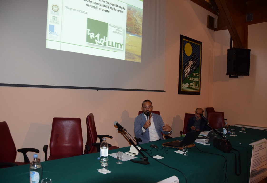 Gli aspetti scientifici e metodologici sono stati illustrati dal prof. Salvatore Di Fazio, del Dipartimento di Agraria dell’Università Mediterranea di Reggio Calabria. La sua relazione dal titolo “Tranquillity Areas Mapping”, è stata incentrata sull’importanza dell’identificazione e del mantenimento del carattere di “tranquiliità” del paesaggio nel quadro della pianificazione territoriale. Si è fatto specifico riferimento alla Convenzione Europea sul Paesaggio, ai servizi ecosistemici forniti da quest’ultimo, all’importanza delle aree tranquille per il benessere della popolazione, alle ricadute economiche della loro tutela e valorizzazione anche per lo sviluppo di molteplici attività che possono avvantaggiarsene (educative, ricreative, turistiche, socio-sanitarie, ecc.). Il prof. Giuseppe Modica, nella sua relazione dal titolo “La mappatura delle aree tranquille nella pianificazione sostenibile delle aree naturali protette” ha approfondito, da un punto di vista metodologico e procedurale, le fasi di raccolta, analisi e trattamento dei dati finalizzati alla produzione delle mappe di tranquillità. Le due relazioni sono state supportate dai risultati della ricerca sul tema avviata dal gruppo RurAL (Rural Architecture and Landscape) del Dipartimento di Agraria sin dal 2012 e che ha condotto ad una prima applicazione della metodologia nel territorio del Parco Regionale delle Serre (VV).