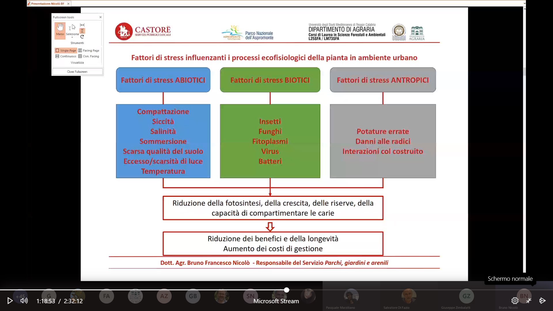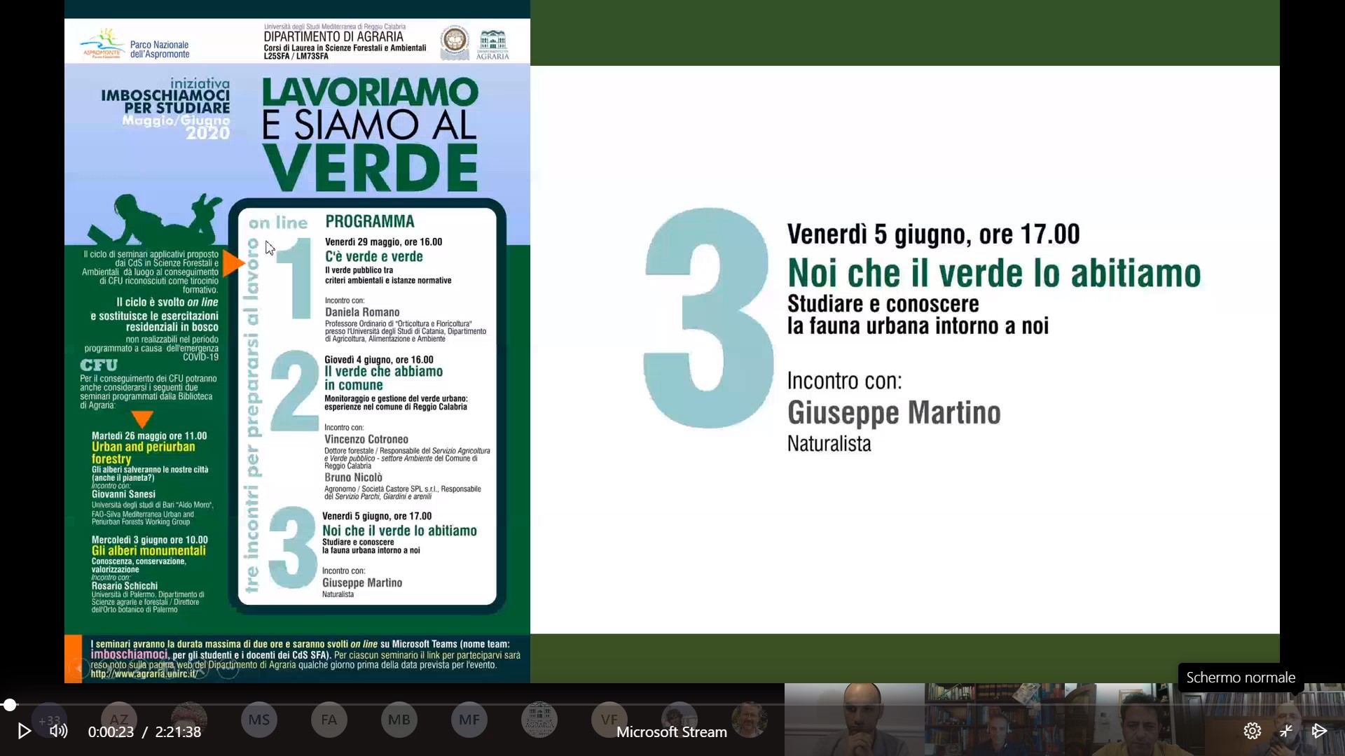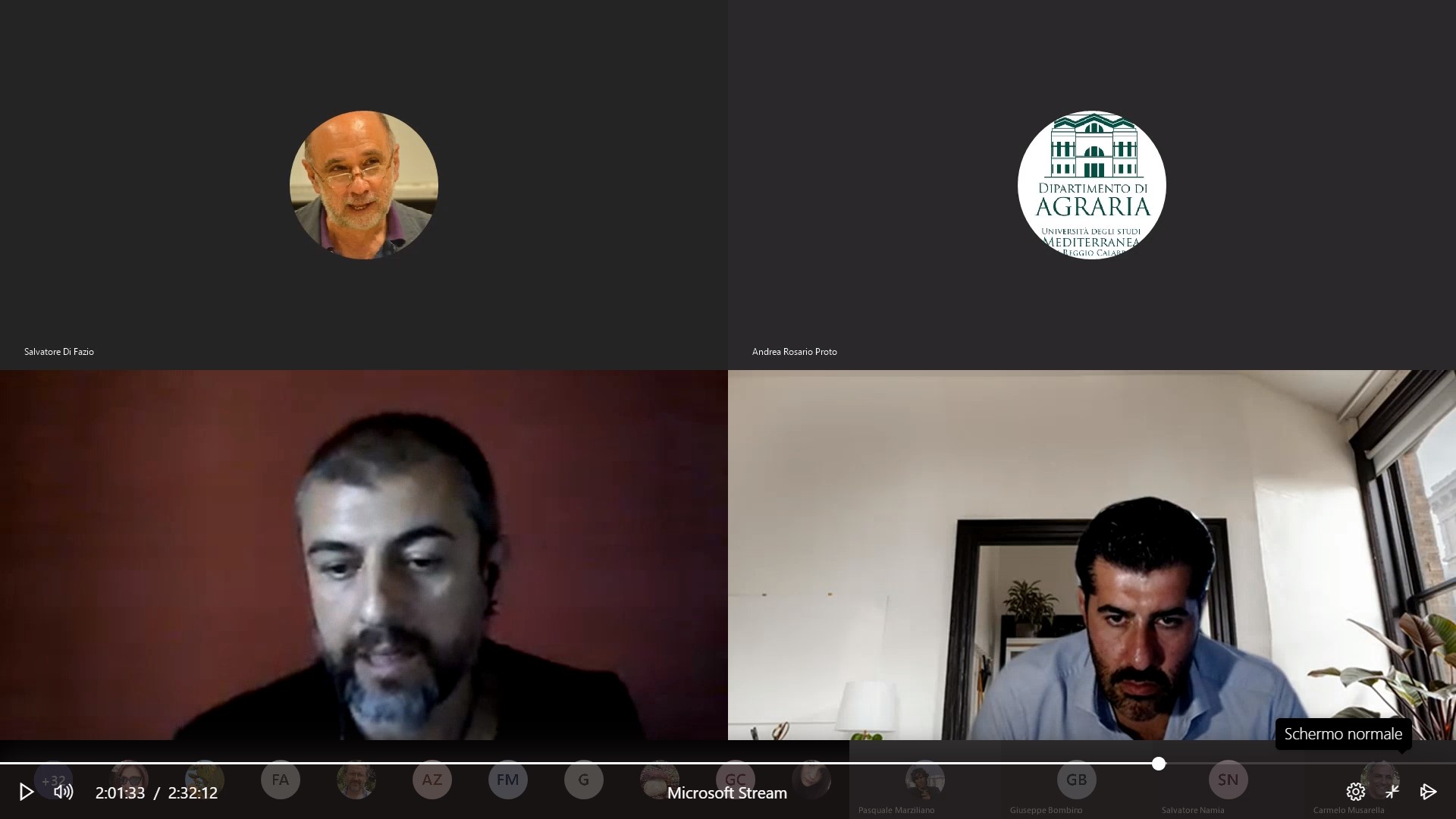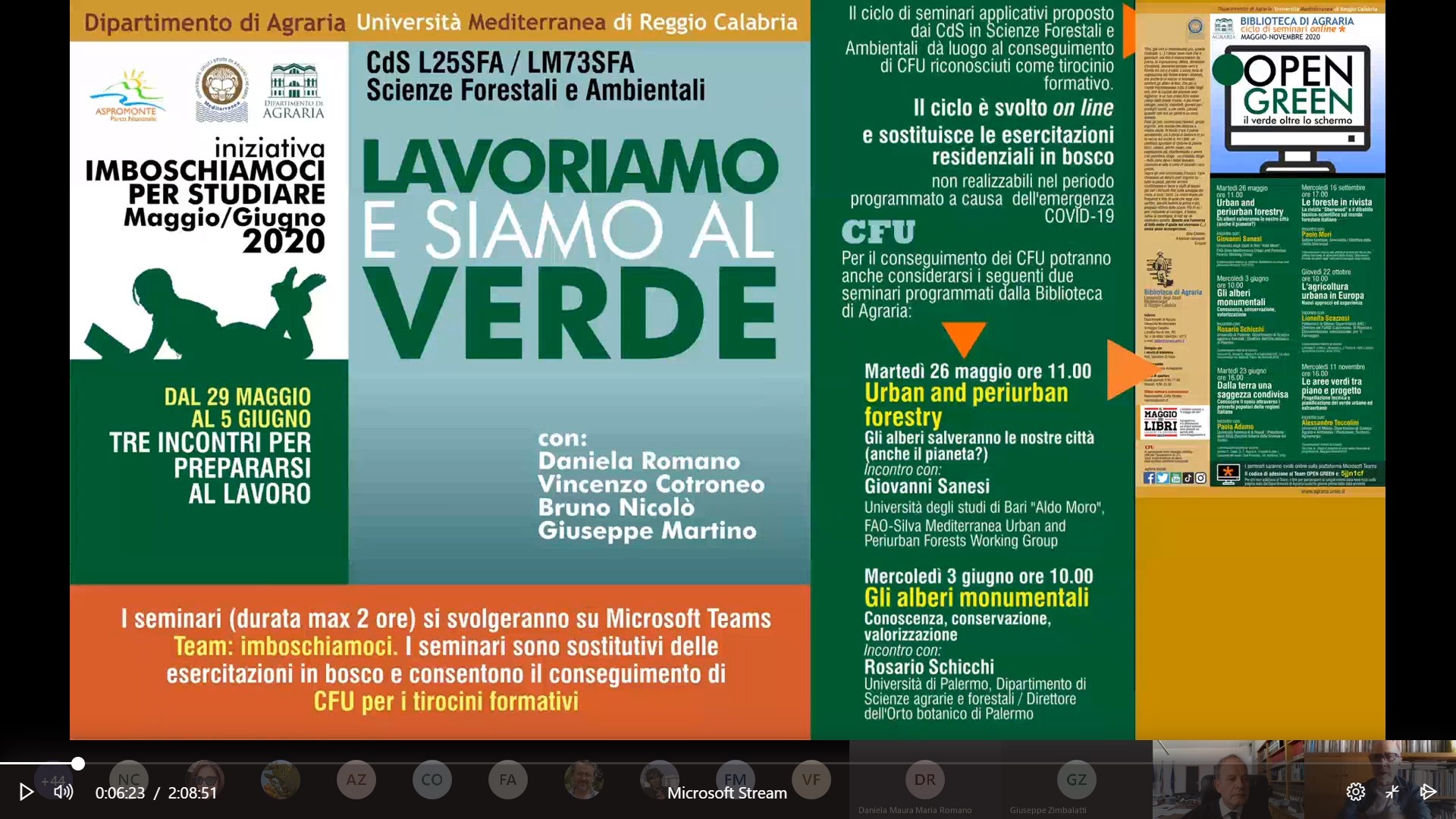 Dal 26 maggio al 5 giugno, sono stati proposti cinque seminari on-line, svolti sulla piattaforma Microsoft Teams. I primi due, condivisi con la Biblioteca di Agraria nel ciclo “Open Green: Il verde oltre lo schermo”, hanno trattato i temi della Selvicoltura urbana e peri-urbana (26 maggio) e degli Alberi monumentali (3 giugno), avendo come relatori i professori Giovanni Sanesi (Università di Bari) e Rosario Schicchi (Università di Palermo). Resoconti estesi di tali seminari sono già stati pubblicati sul sito istituzionale del Dipartimento: