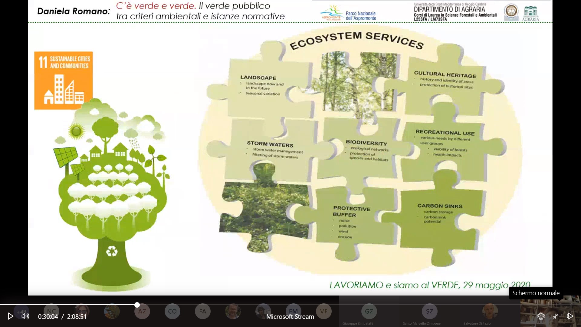 Il primo incontro della serie, svoltosi il 29 maggio, è stato guidato dalla Prof.ssa Daniela Romano (Università di Catania), che ha svolto il tema “C’è verde e verde: il verde pubblico tra criteri ambientali e istanze normative”. La relatrice ha trattato le funzioni e i servizi forniti dal verde pubblico e ne ha rimarcato il contributo dato al raggiungimento degli obiettivi di sostenibilità. Anche il verde, tuttavia, deve a sua volta essere pianificato, progettato e gestito in modo sostenibile nel rispetto di specifici criteri definiti dal recente DM n. 63 del 10 marzo 2020, recante “Criteri ambientali minimi (CAM) per il servizio di gestione del verde pubblico e la fornitura di prodotti per la cura del verde”. I CAM sono una componente essenziale del necessario approccio strategico di medio-lungo periodo, affinché le stazioni appaltanti, in particolare le amministrazioni comunali, si dotino e applichino concretamente gli strumenti più avanzati di gestione del verde pubblico, quali il censimento del verde, il piano del verde, il regolamento del verde pubblico e il bilancio arboreo (che rappresentano la base per una corretta ed efficace gestione del verde urbano). In tal modo si potranno evitare interventi sul territorio qualitativamente scarsi o addirittura dannosi, con conseguente aggravio di costi per la comunità. I singoli criteri sono stati analizzati e, nella parte finale del suo intervento, la Prof.ssa Romano ha mostrato degli esempi coerenti di rivitalizzazione degli spazi urbani. Tra gli altri, sono stati mostrati esempi di recupero funzionale e inverdimento di infrastrutture dismesse, forme di gestione partecipativa del verde, esperienze di agricoltura e di selvicoltura urbana svolte anche con intento sociale.