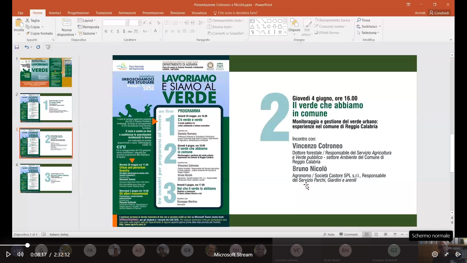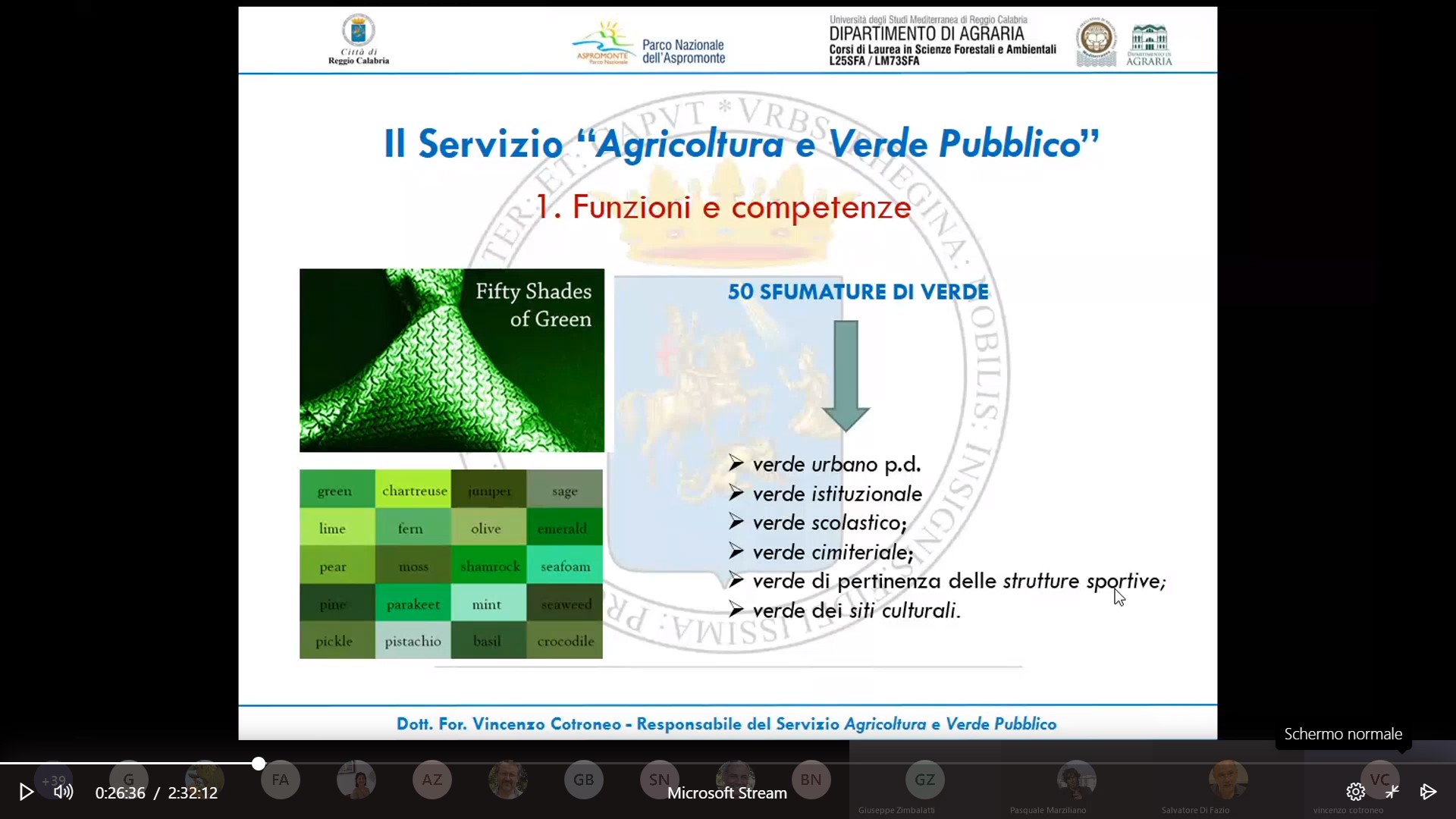 Il 4 giugno ha avuto luogo il secondo seminario del ciclo, che ha trattato i risvolti applicativi dei contenuti introdotti dalla Prof.ssa Romano e li ha inquadrati nella normativa vigente, vedendoli alla luce della L. 10 del 2013 “Norme per lo sviluppo degli spazi verdi urbani”. Si sono approfondite analisi tematiche in ambito comunale, sul monitoraggio e sulla gestione del verde pubblico. Il seminario ha avuto per titolo “Il verde che abbiamo in comune” e relatori ne sono stati il dottore forestale Vincenzo Cotroneo (Responsabile del Servizio Agricoltura e Verde pubblico - settore Ambiente del Comune di Reggio Calabria) e l’agronomo dott. Bruno Nicolò (Responsabile del Servizio Parchi, Giardini e arenili della società Castore SPL s.r.l.). I relatori, non solo hanno trattato aspetti tecnici e operativi in materia, ma li hanno riferiti alla loro personale esperienza professionale, collegando quest’ultima agli studi compiuti ad Agraria e alla formazione successiva.