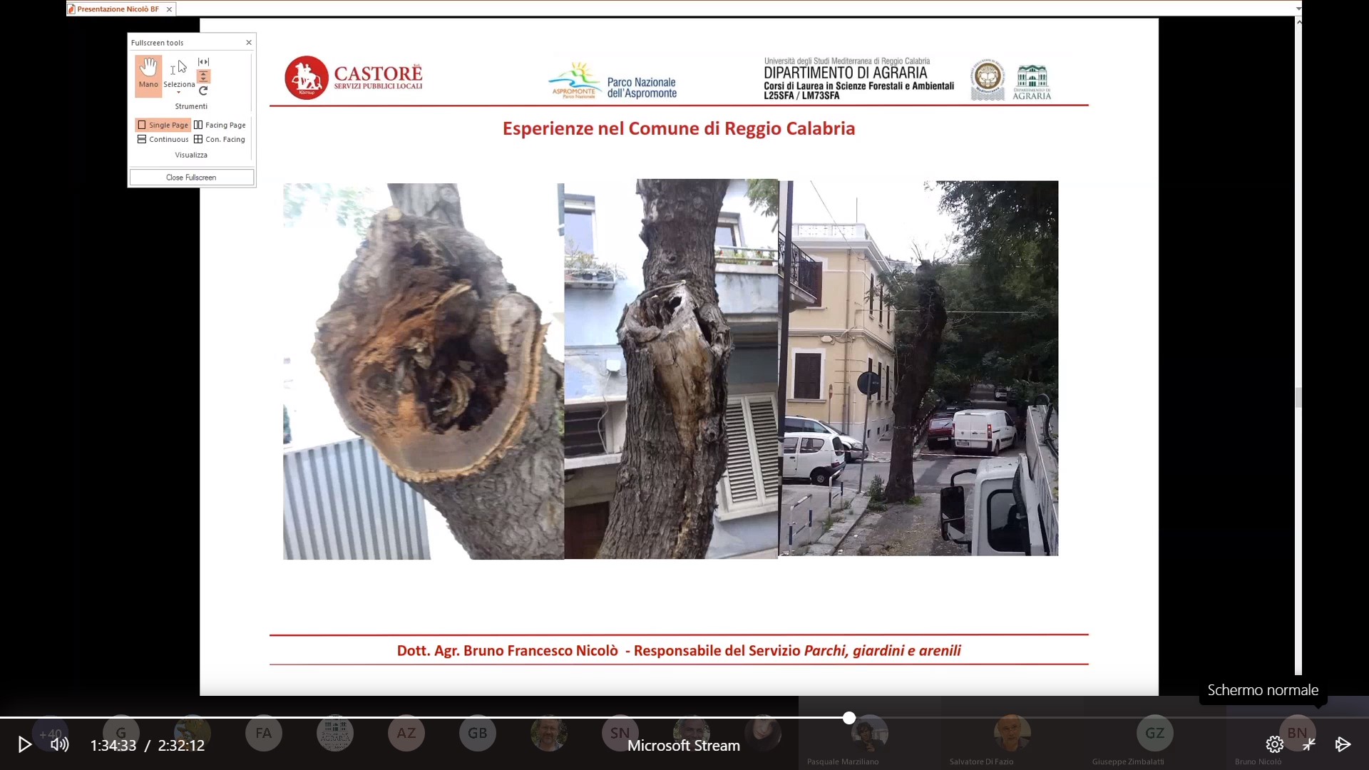 Al dott. Siclari è stato riservato un intervento di chiusura del ciclo di seminari. Egli ha sottolineato come un indubbio merito dell’iniziativa sia stato quello di farci conoscere un mondo, quello della natura, che non ha confini. Ciò proprio nel periodo in cui tutti abbiamo sofferto il confinamento domestico o urbano. “Molti quest’anno, proprio l’anno in cui non andiamo insieme in bosco, si saranno chiesti cosa c’entra il Parco dell’Aspromonte, un Parco naturale nazionale, con dei seminari che trattano il verde urbano o la fauna urbana. Invece il Parco c’entra, proprio perché la realtà non è compartimentata in spazi a tenuta stagna. Un parco irradia quello che ha al suo interno e riceve molto dall’esterno. Nel nostro caso, il Parco dell’Aspromonte vive una relativa prossimità con il centro urbano di Reggio Calabria e incorpora parte del territorio comunale, perciò è importante vedere l’interazione tra l’ecosistema urbano e l’ecosistema naturale”. Riferendosi inoltre alla propria esperienza, il dott. Siclari ha sottolineato la valenza formativa di “Imboschiamoci”, anche per la possibilità che offre agli studenti di relazionarsi con laureati in Agraria che operano professionalmente in campo ambientale e forestale, così apprendendo le opportunità di lavoro e i necessari percorsi di formazione. “Io mi considero un caso emblematico” ha detto Siclari agli studenti “perché mi sono laureato con una tesi sul latte di capra e ho finito per occuparmi di fauna selvatica lavorando in un Parco nazionale. Cosa c’è stato in mezzo? Ho tenuto viva la mia curiosità e ho continuato a studiare e a formarmi, anche dopo la laurea, dovendo apprendere tante cose nuove. Il bello di questa esperienza che fate è che tiene viva la curiosità. La curiosità è il vero enzima che attiva la conoscenza. Di studiare non si finisce mai, lo sapete, ma lo studio diventa davvero bello se resta viva la curiosità”.
