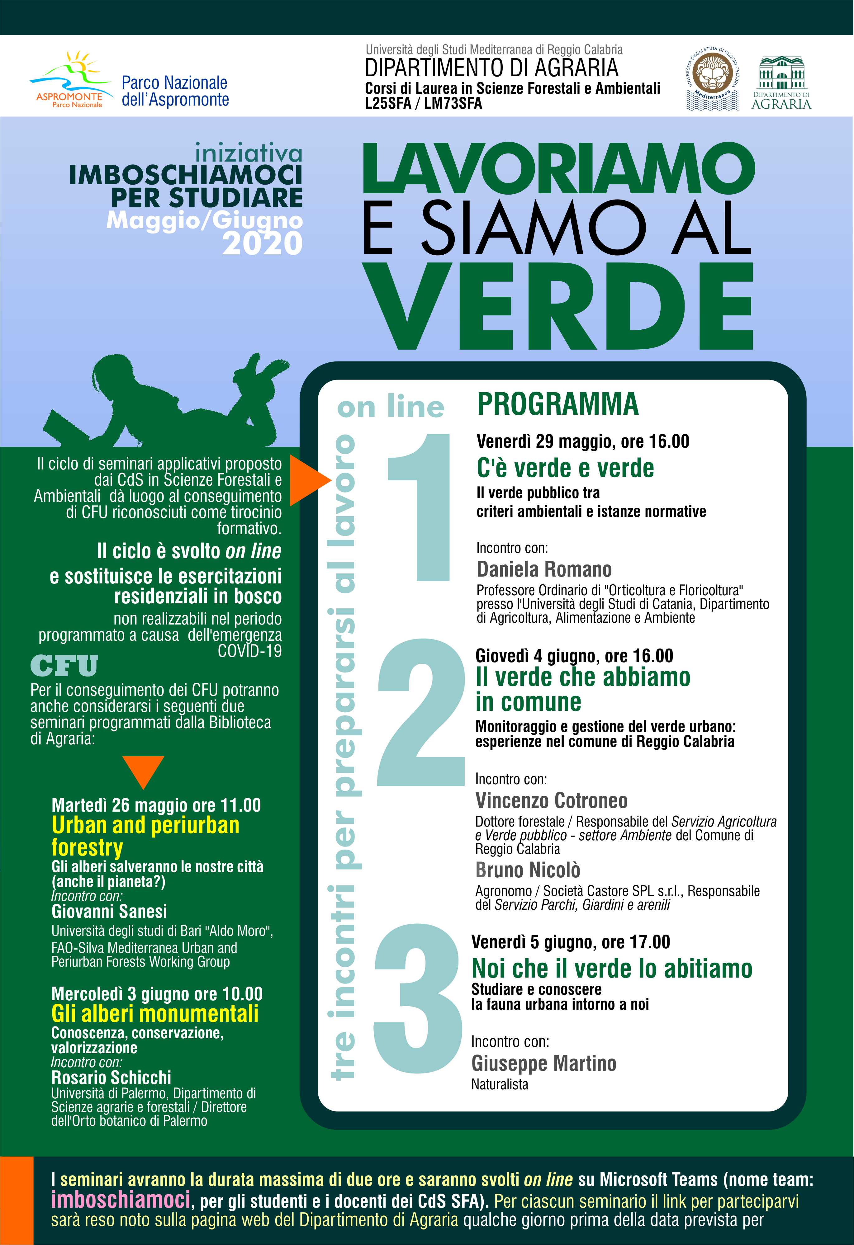 Quest’anno l’emergenza Covid-19 non ha consentito di svolgere “Imboschiamoci 2020” in forma residenziale nel Parco Nazionale dell’Aspromonte, così come già era stato previsto. Ciononostante, con il Patrocinio del Parco, il Dipartimento ha offerto agli studenti la possibilità di vivere on-line un’interessante esperienza formativa, incentrata sul verde urbano e periurbano. In tal modo si è focalizzata l’attenzione sulla qualità dei luoghi di vita e sugli ecosistemi urbani, così fortemente messi in questione proprio durante l’emergenza sanitaria. Inoltre, si sono voluti affrontare i nuovi contenuti con cui da quest’anno i corsi di laurea in Scienze forestali e ambientali hanno ampliato la loro offerta formativa, con l’istituzione dei nuovi curriculum sulla progettazione e gestione delle aree verdi.