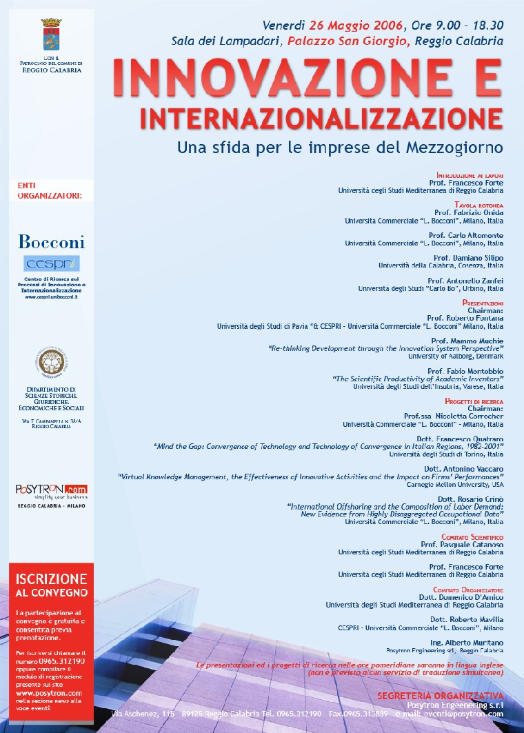 Venerdì 26 maggio dalle ore 9.30 alle 18.30 Sala dei Lampadari, Palazzo San Giorgio Convegno internazionale INNOVAZIONE E INTERNAZIONALIZZAZIONE: una sfida per le imprese del Mezzogiorno Organizzato da: CESPRI (Centro di Ricerca sui Processi di Innovazione e Internazionalizzazione) - Università Commerciale “L. Bocconi” di Milano (www.cespri.unibocconi.it), Dipartimento di Scienze Storiche Giuridiche Economiche e Sociali - Università Mediterranea, POSYTRON Engeenering S.r.l., con il Patrocinio del Comune di Reggio Calabria.