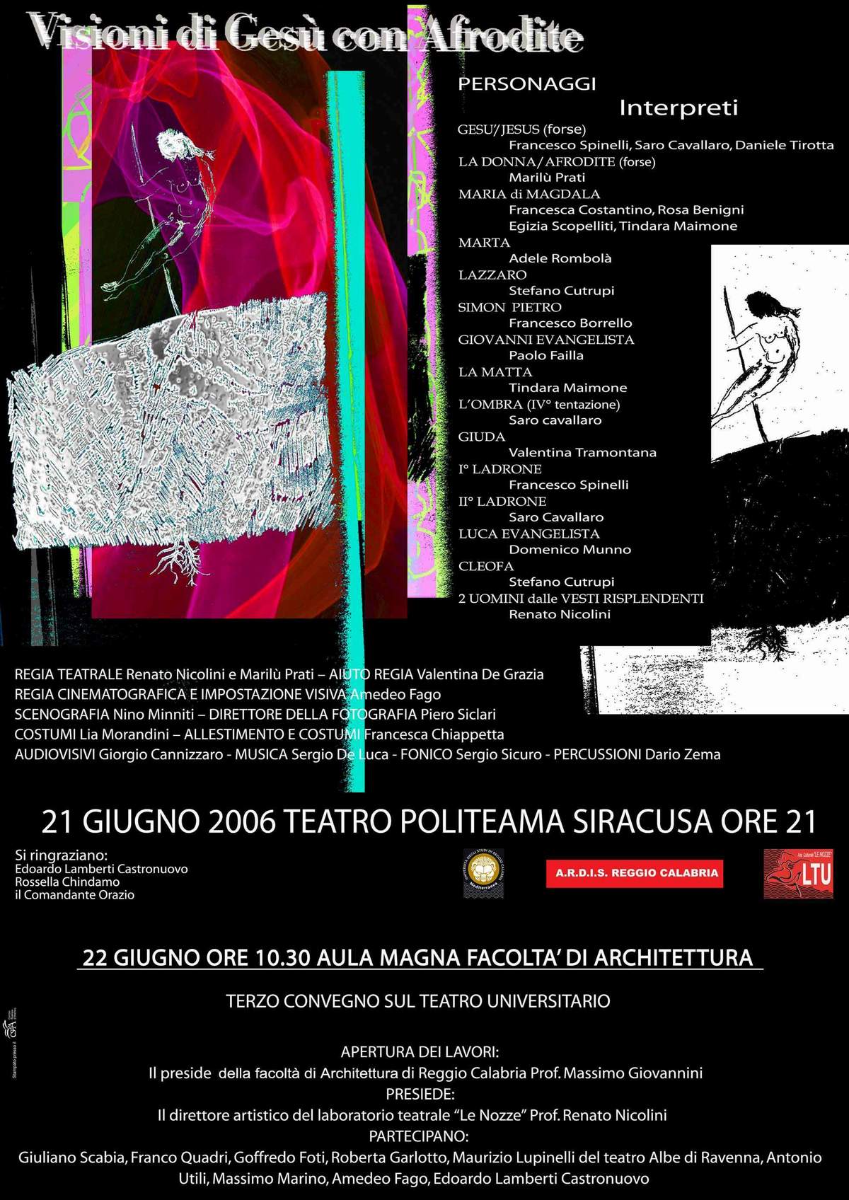 Visioni di Gesù con Afrodite di Giuliano Scabia,drammaturgo, poeta,inventore negli anni ’60 del Teatro Vagante..Forma di teatro itinerante che ha attraversato l’Italia con i suoi attori, musici, cantanti e grandi pupazzi, stendardi su carrette o furgoni, tentando di raccontarne la “vera storia”. Mitiche le rappresentazioni con il “Gorilla Quadrumano”, nei paesi dell’Appennino e poi a Mira davanti alla Mira Lanza, e con “Marco Cavallo” per i pazienti dell’ospedale psichiatrico di Trieste diretto da Franco Basaglia, Gli spettacoli di quegli anni sono stati filmati da Amedeo Fago, regista cinematografico, scenografo e fondatore del Politecnico; uno dei più noti spazi d’avanguardia, cineclub-teatro, della Roma degli Anni Settanta da cui nascerà l’Estate Romana di Renato Nicolini.