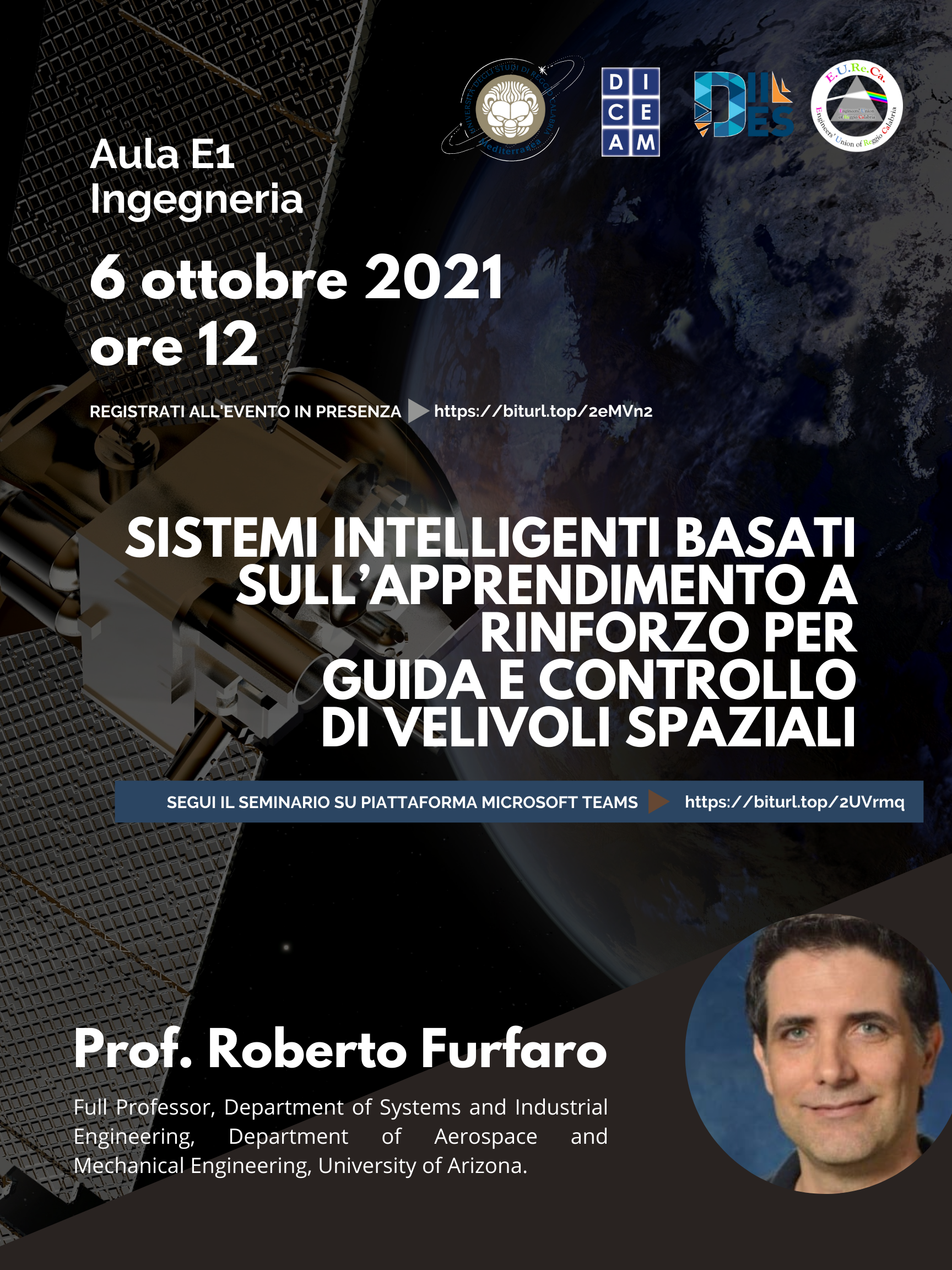 Seminario “Sistemi Intelligenti Basati sull’Apprendimento a Rinforzo per Guida e Controllo di Velivoli Spaziali” – Prof. Roberto Furfaro, 6 ottobre 2021
