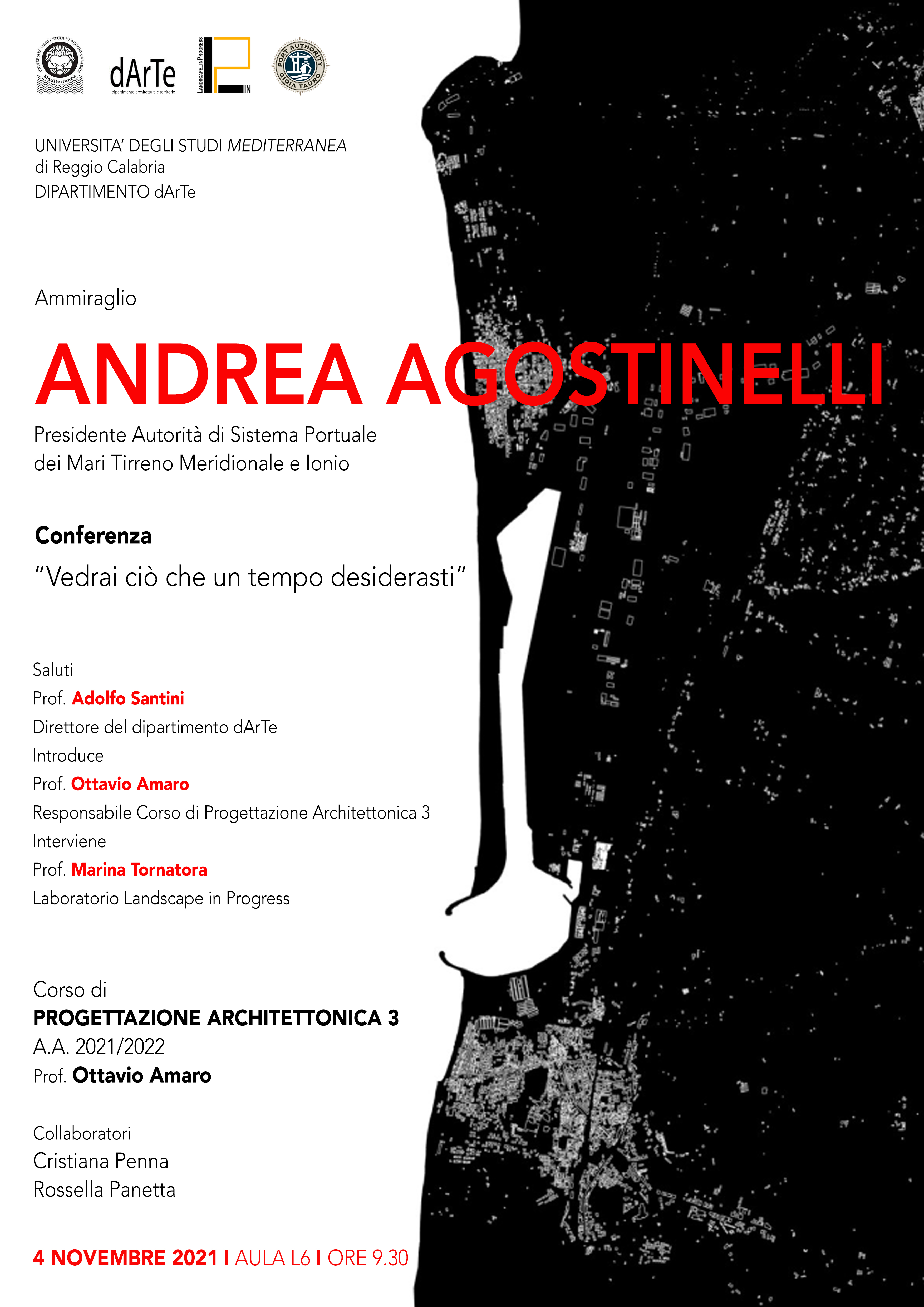 Giorno 4 novembre 2021 alle ore 9.30 nell’aula L6 del plesso di Architettura si terrà la conferenza dell’Ammiraglio Andrea Agostinelli Presidente dell’Autorità di Sistema Portuale dei Mari Tirreno Meridionale e Ionio.