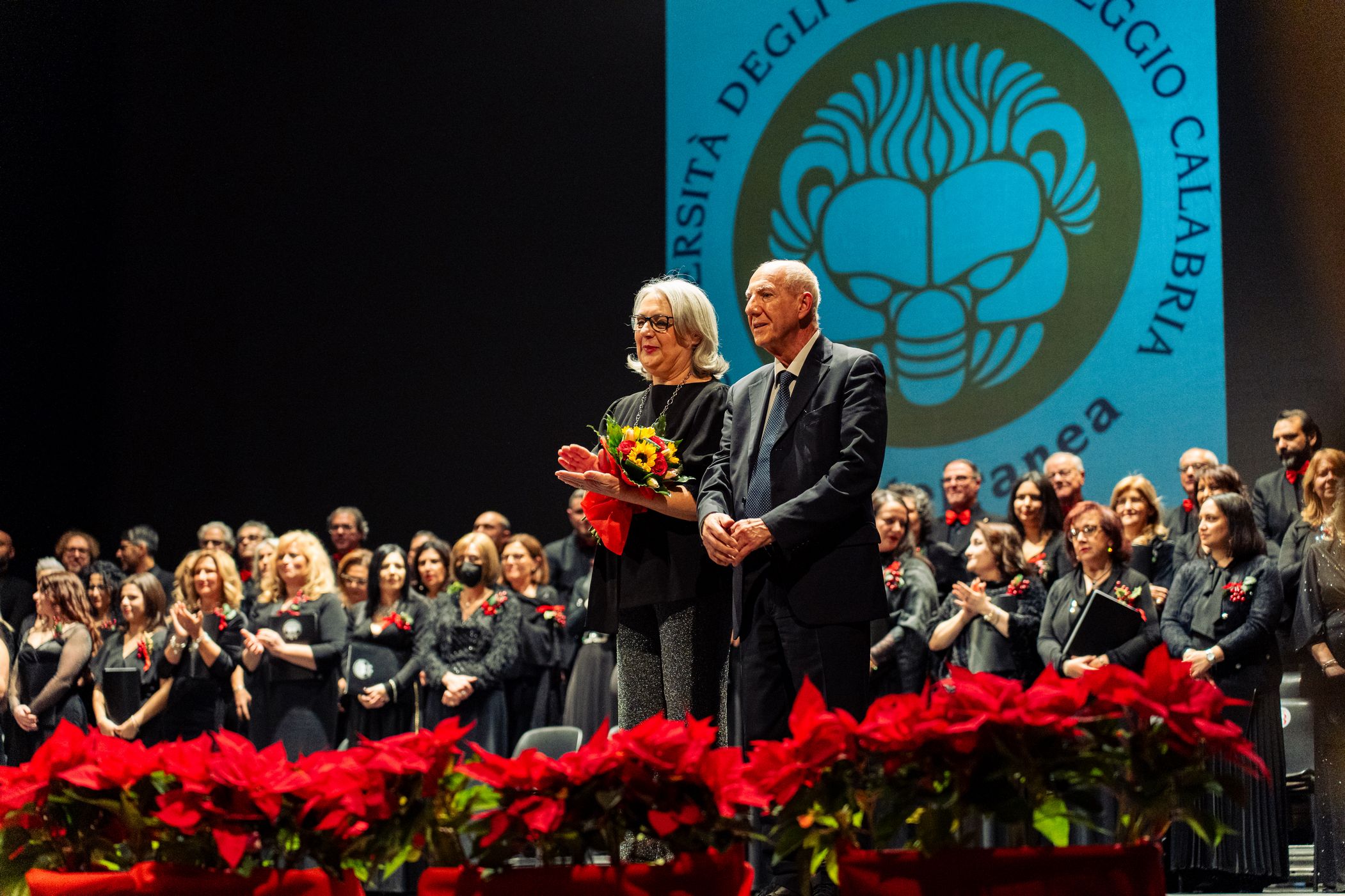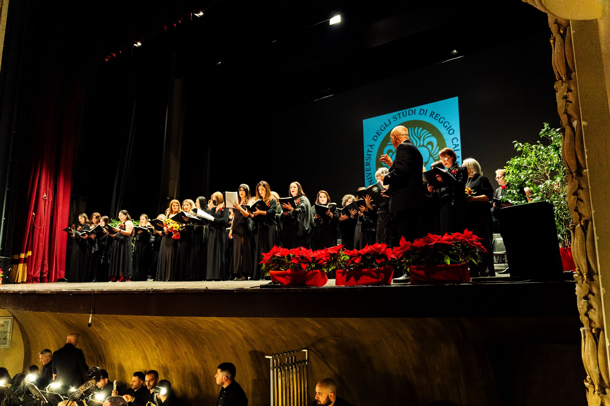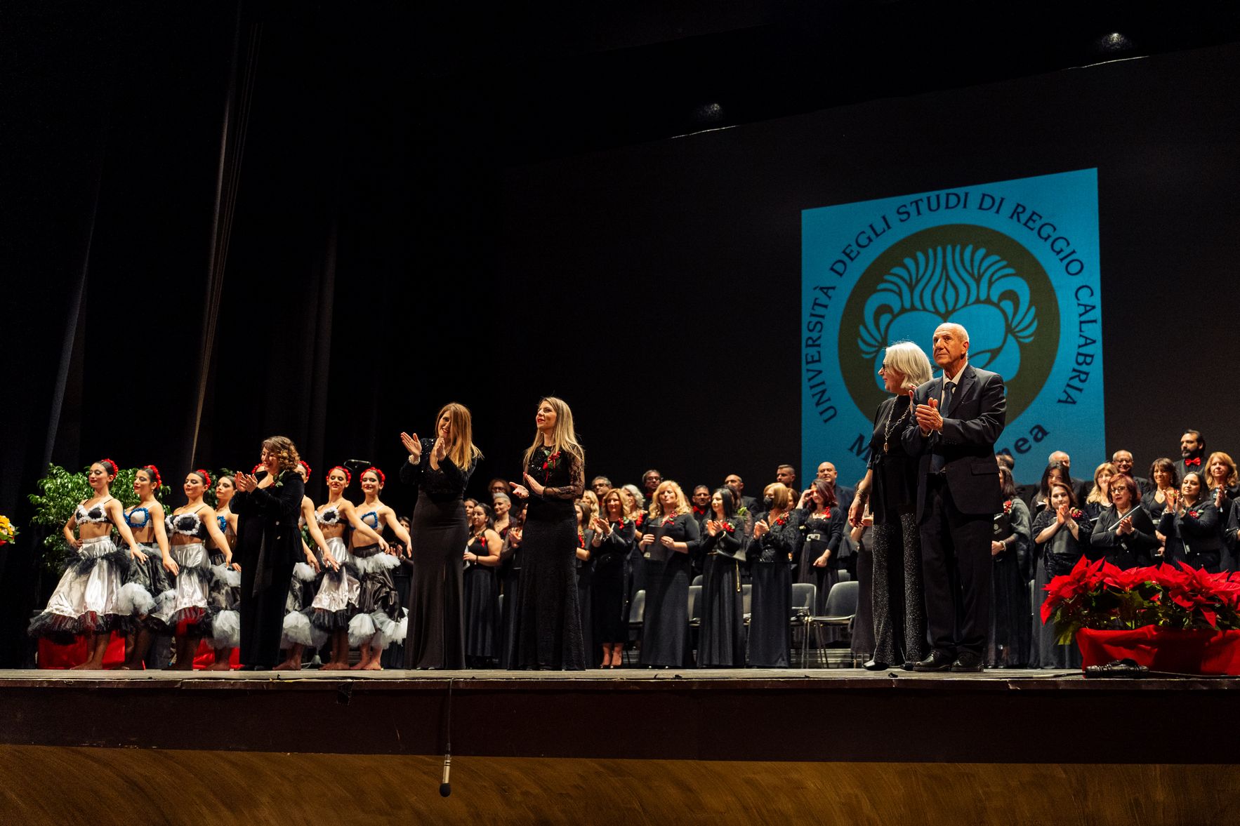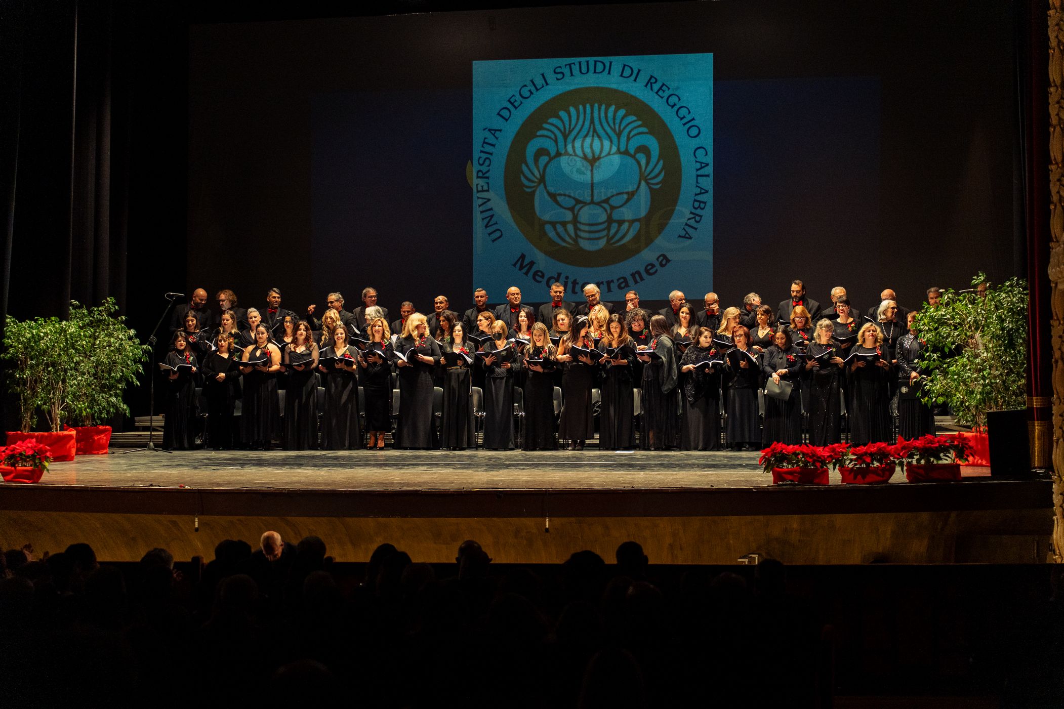 Sul palco, emozionante esibizione del Coro Polifonico dell'Università Mediterranea, guidato dai Maestri del coro Carmen Cantarella e Claudio Bagnato assieme all'Orchestra del Teatro Francesco Cilea ed al Coro Lirico Francesco Cilea.