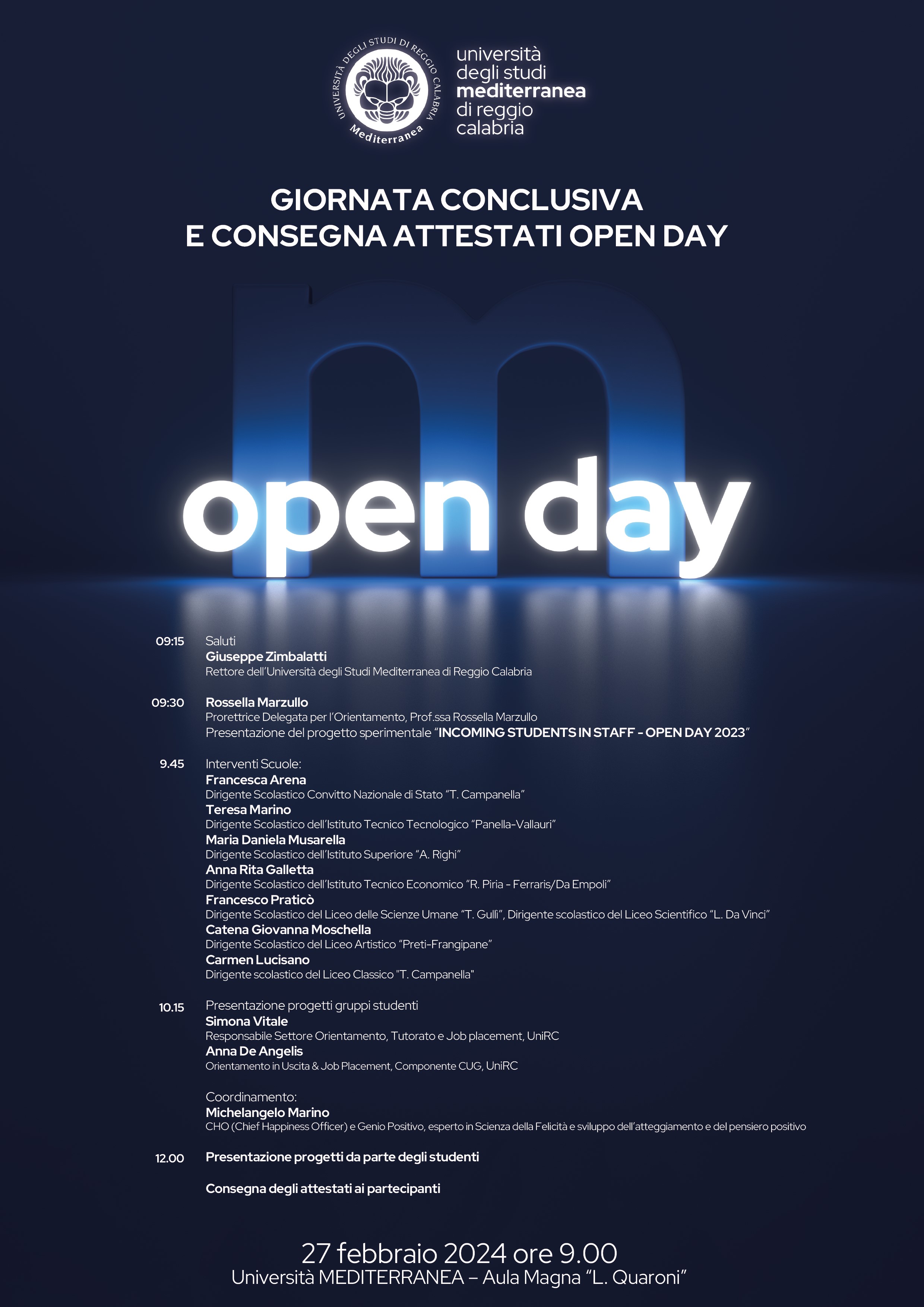 Martedì 27 febbraio alle ore 9.00, in Aula Magna “L. Quaroni” della Cittadella universitaria si terrà la giornata conclusiva del Progetto sperimentale "Incoming Students in Staff - Open Day 2023" che ha visto coinvolti otto istituti scolastici di Reggio Calabria.