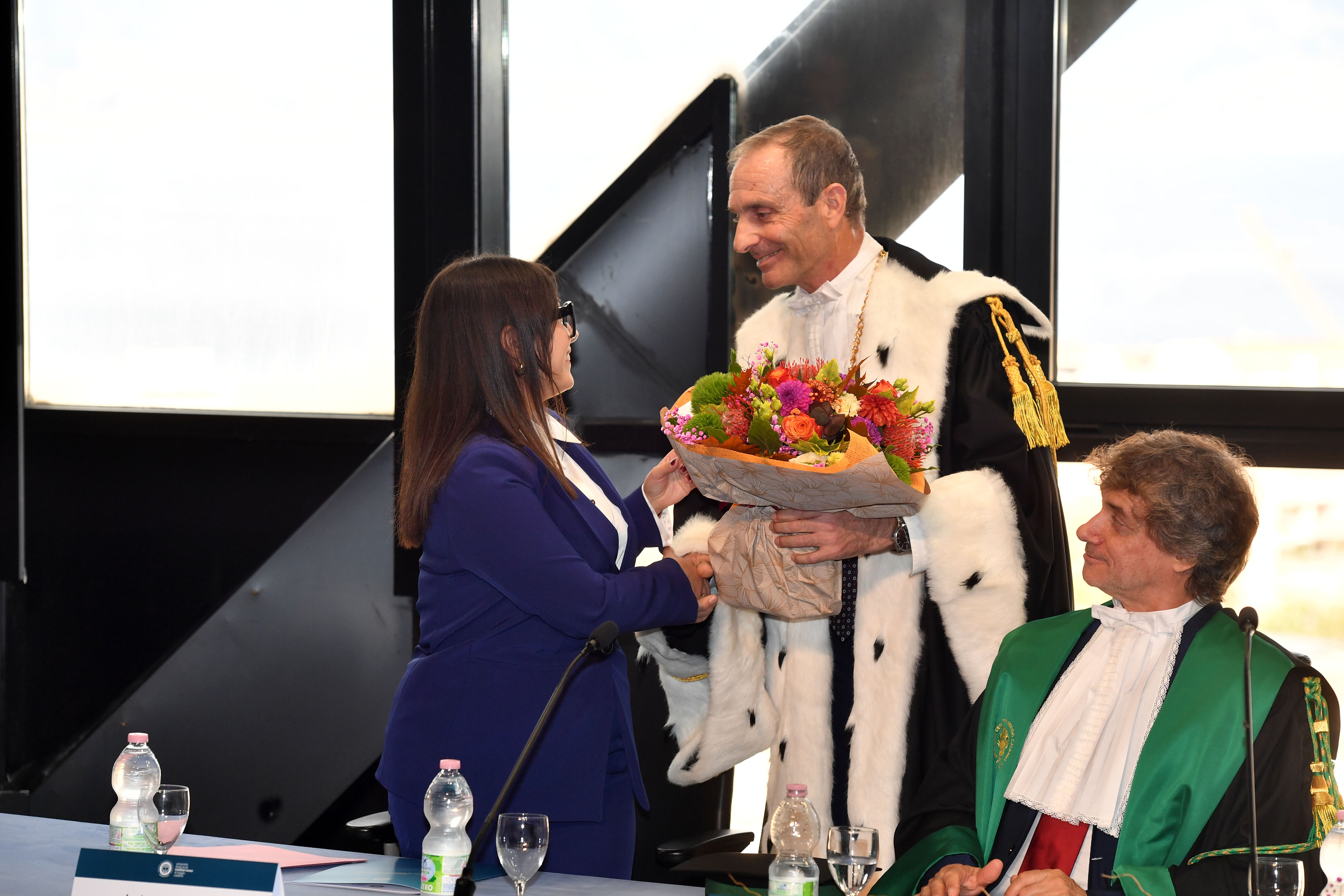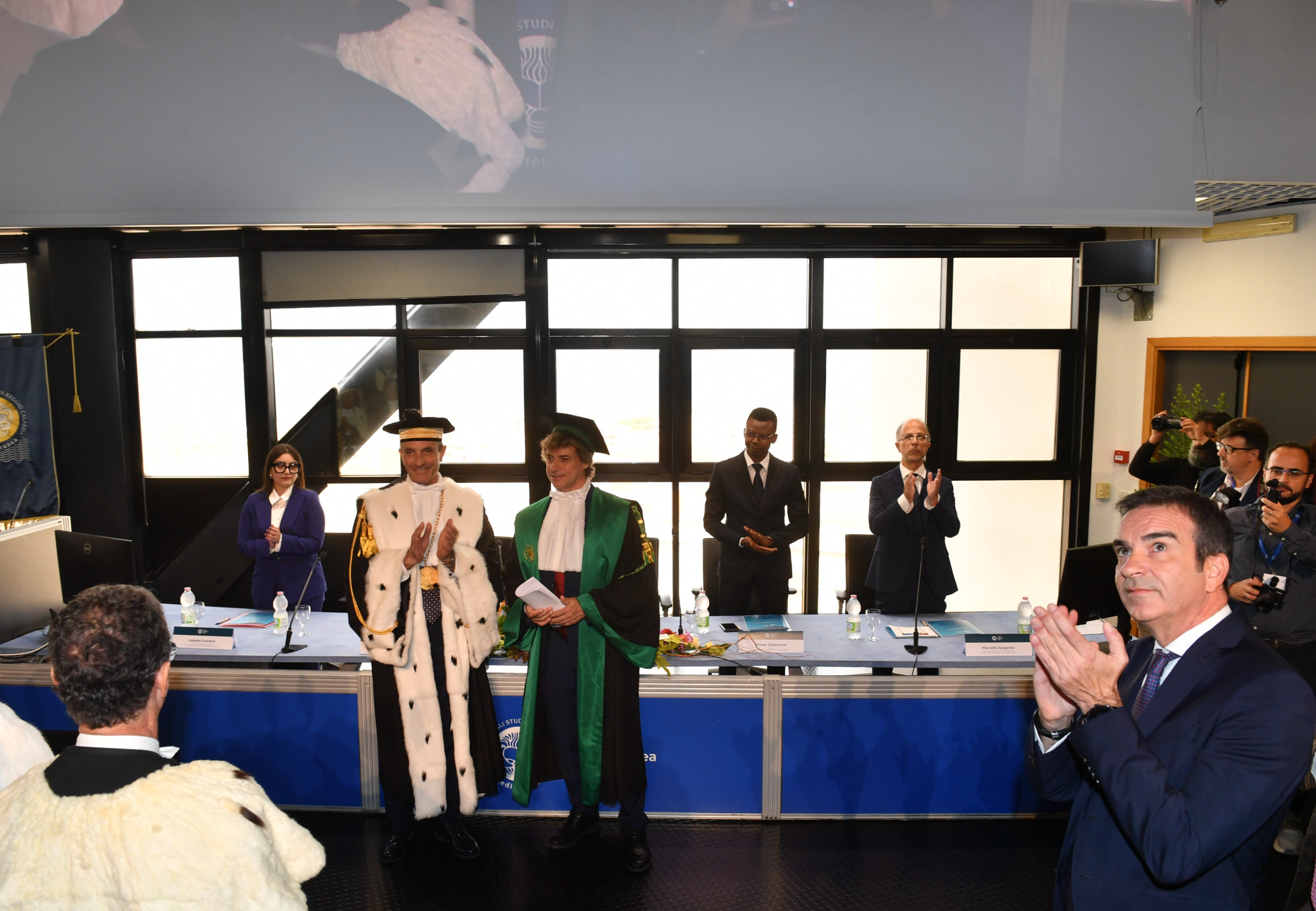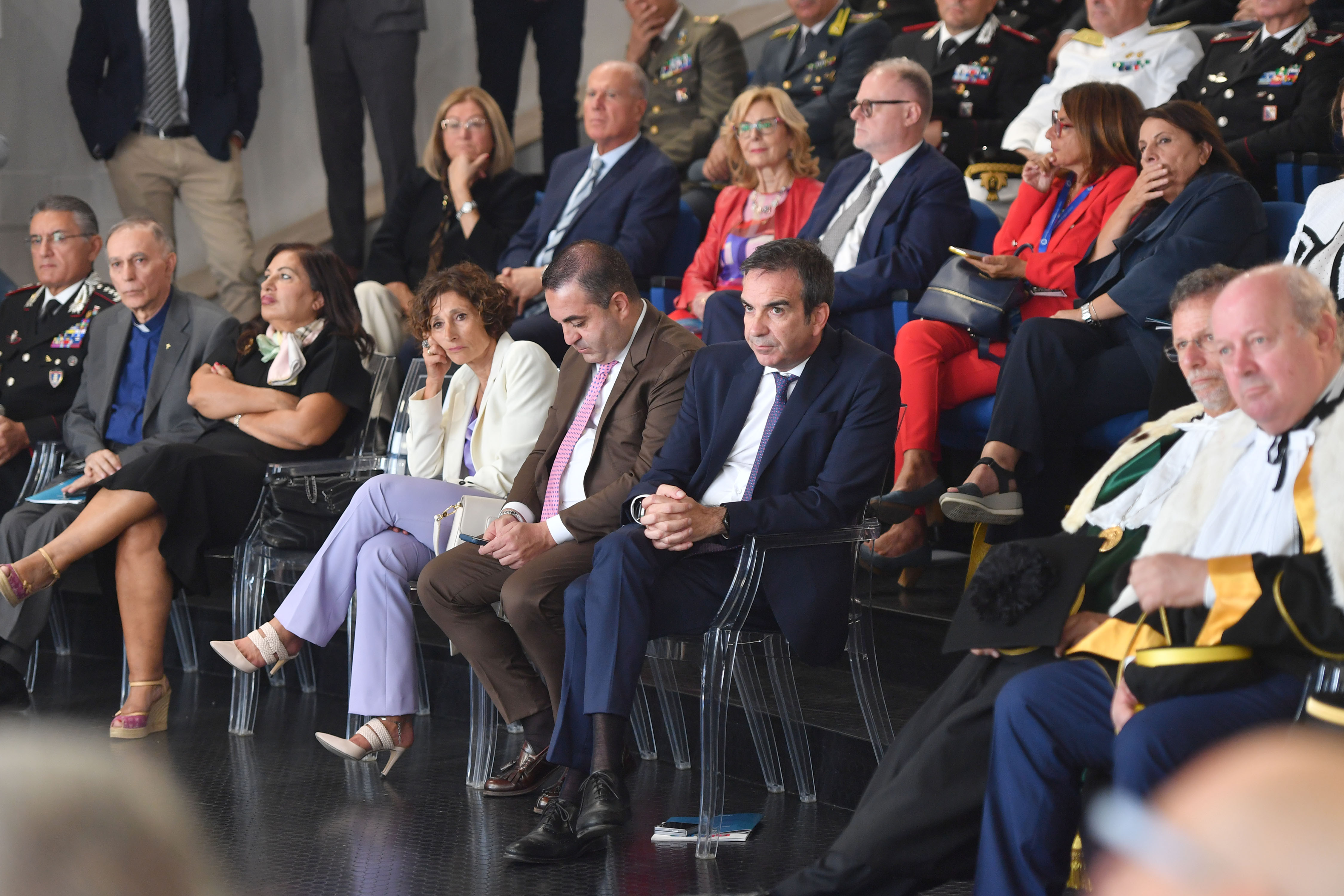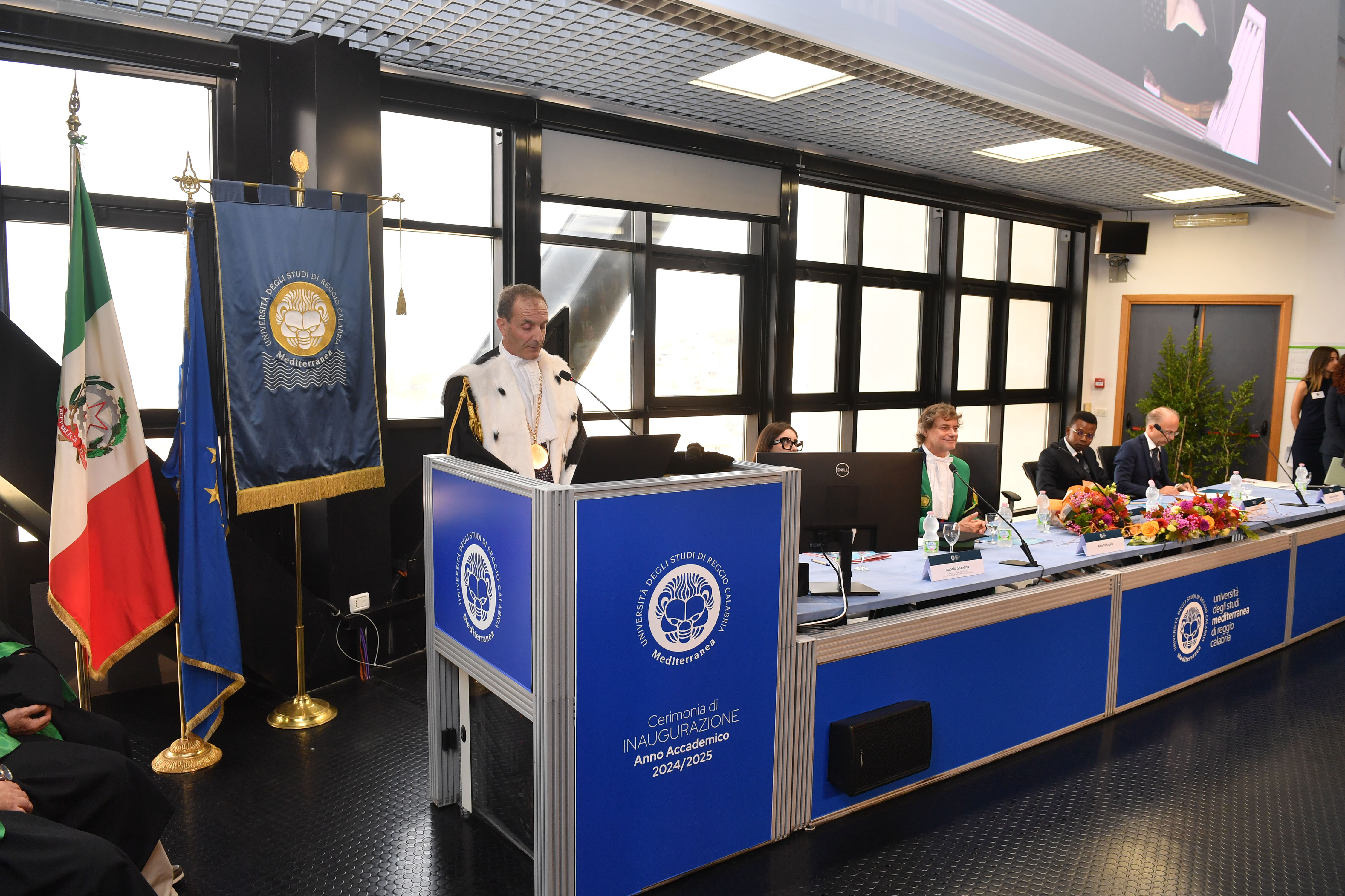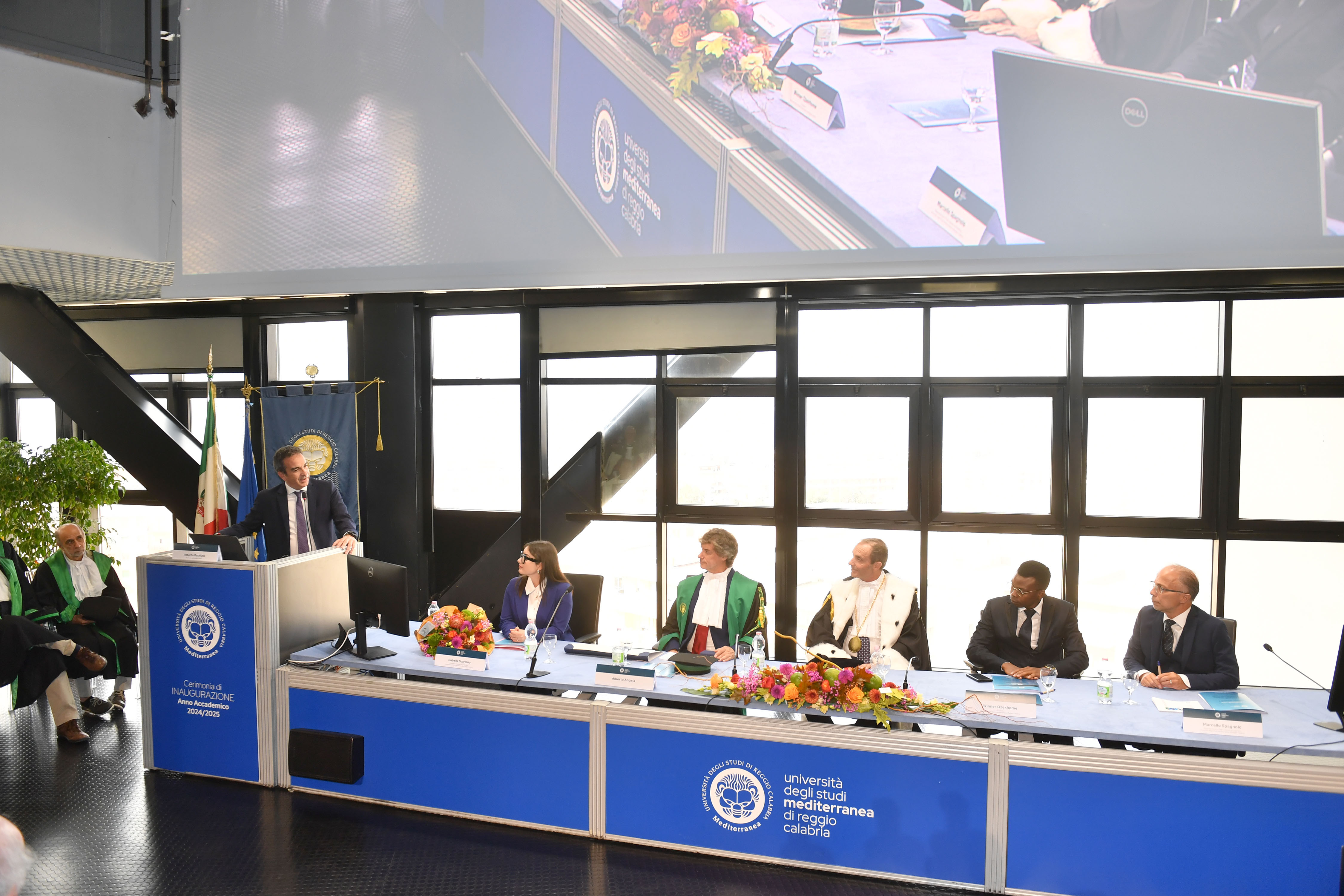 La Cerimonia inaugurale è proseguita con gli interventi degli studenti Isabella Scardino presidente del Consiglio degli Studenti che si è detta onorata di poter parlare a nome di tutti gli studenti della Mediterranea, cuore pulsante di questa università che “ogni giorno dà l'opportunità di crescere non solo come professionisti, ma anche come cittadini del mondo, con una visione aperta, curiosa e innovativa” e dello studente Winner Ozekhome, che, dopo aver conseguito la laurea triennale in Ingegneria informatica, ha proseguito il suo percorso magistrale, commuovendo la platea col racconto della sua vita stravolta durante l’ultimo anno di liceo, quando un commando terroristico di Boko Haram, assaltando il suo Istituto, seminando morte e distruzione, lo obbligò ad un terrificante e disperato viaggio, in cerca di salvezza e libertà, per Winner “quando una passione ti brucia dentro, ti permette di mantenere fisso l’obiettivo della meta da raggiungere, cancellando i dolori e le sofferenze, che lungo il percorso si possono subire”.
