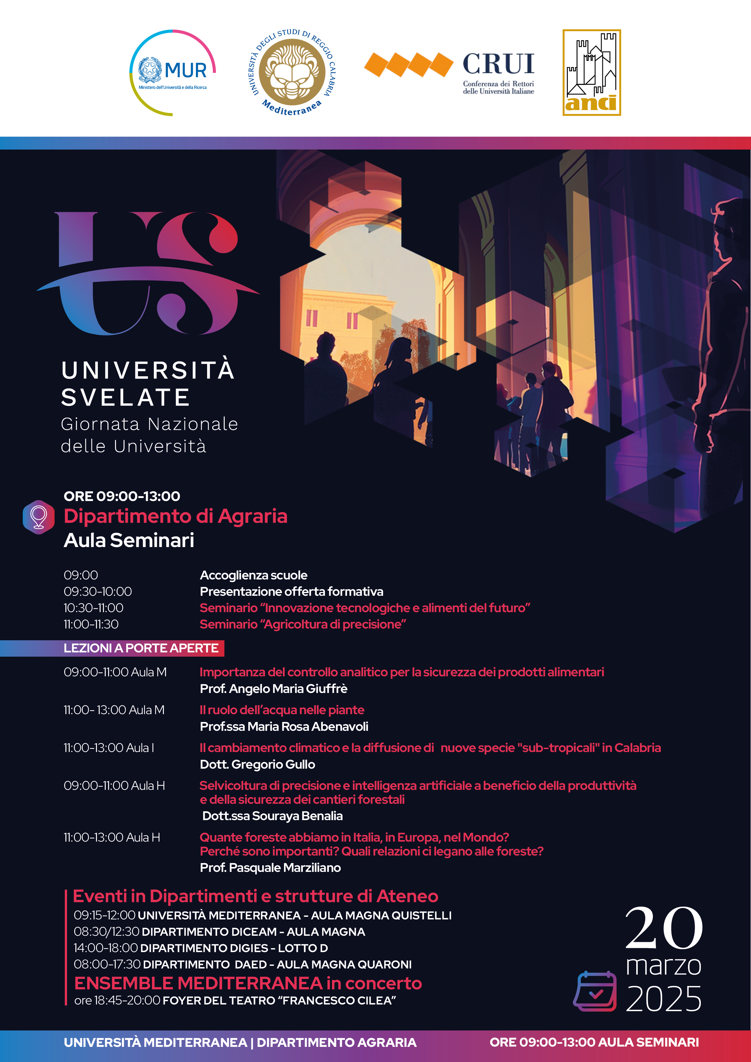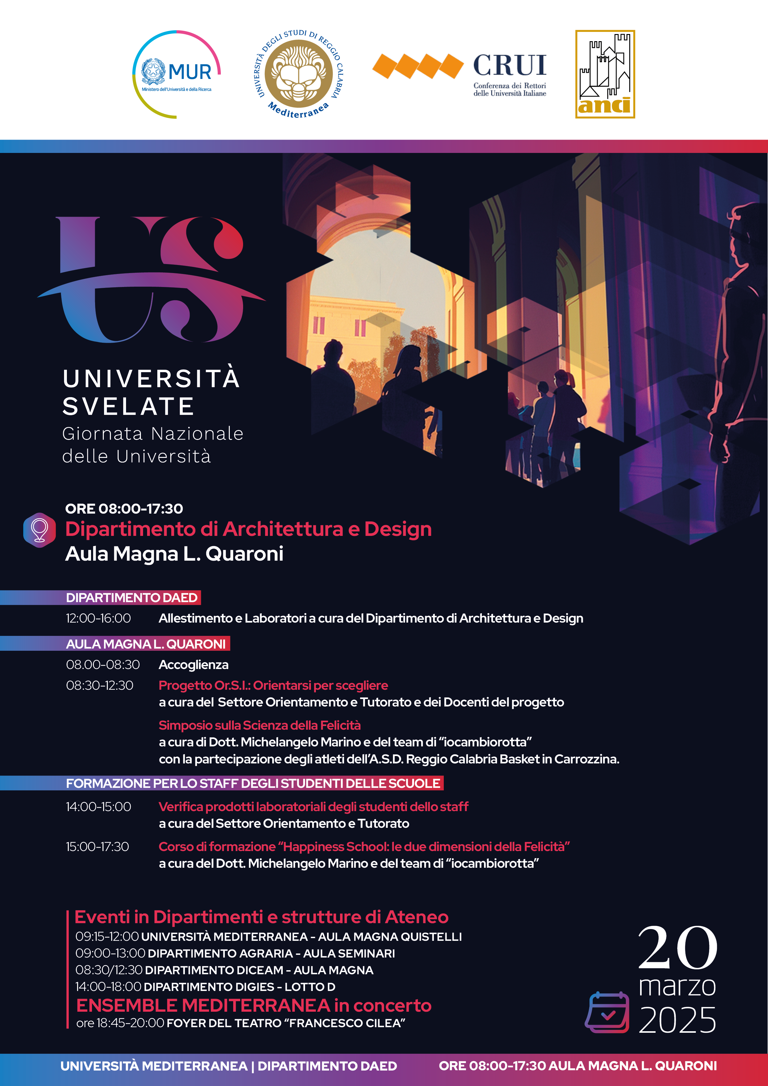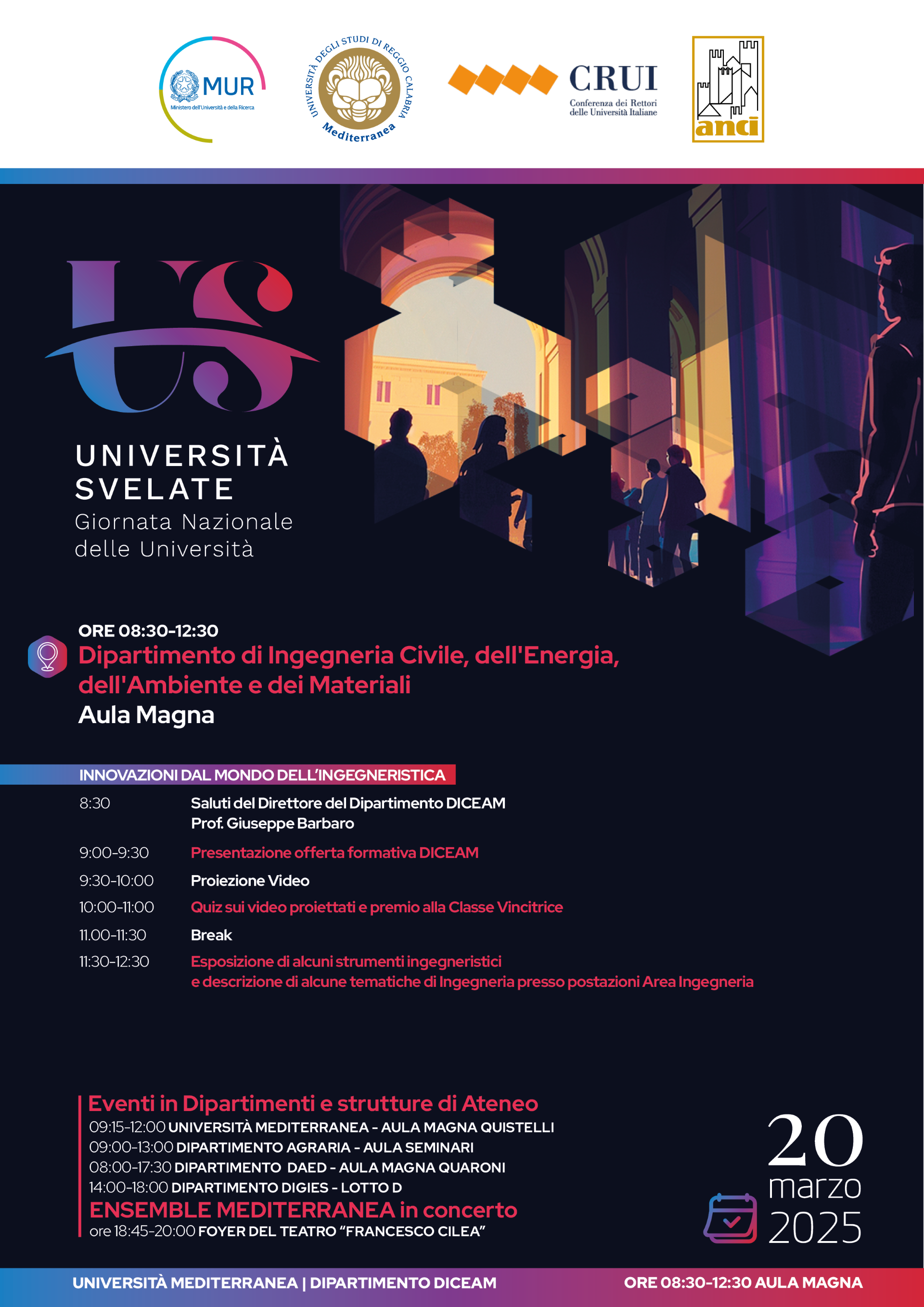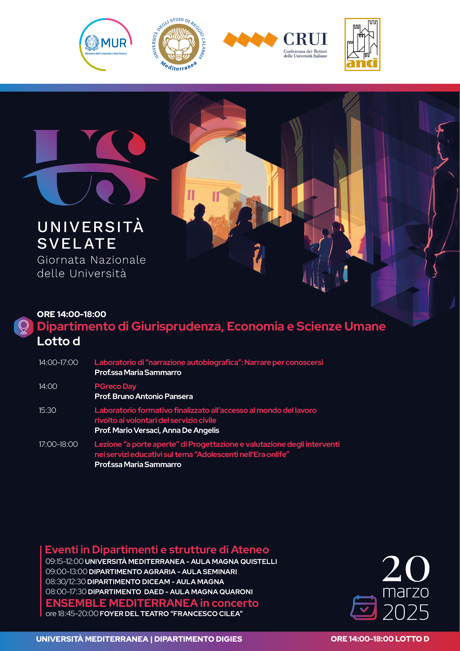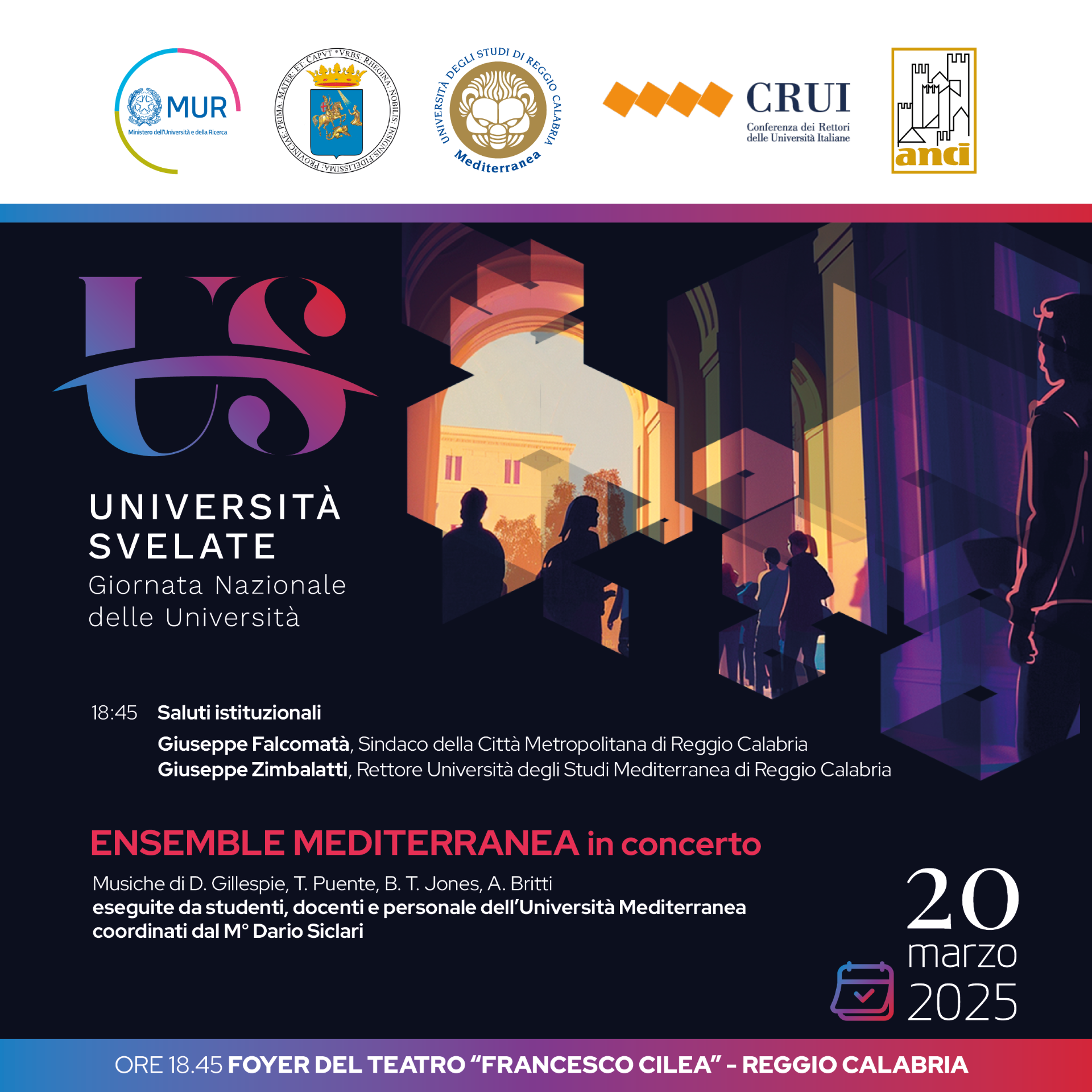 L'evento conclusivo si è tenuto in serata presso il Foyer del Teatro Francesco Cilea che ha ospitato l’esibizione dell’Ensemble Mediterranea, con musiche eseguite da studenti, docenti e personale dell’Ateneo reggino coordinati dal Maestro Dario Siclari.