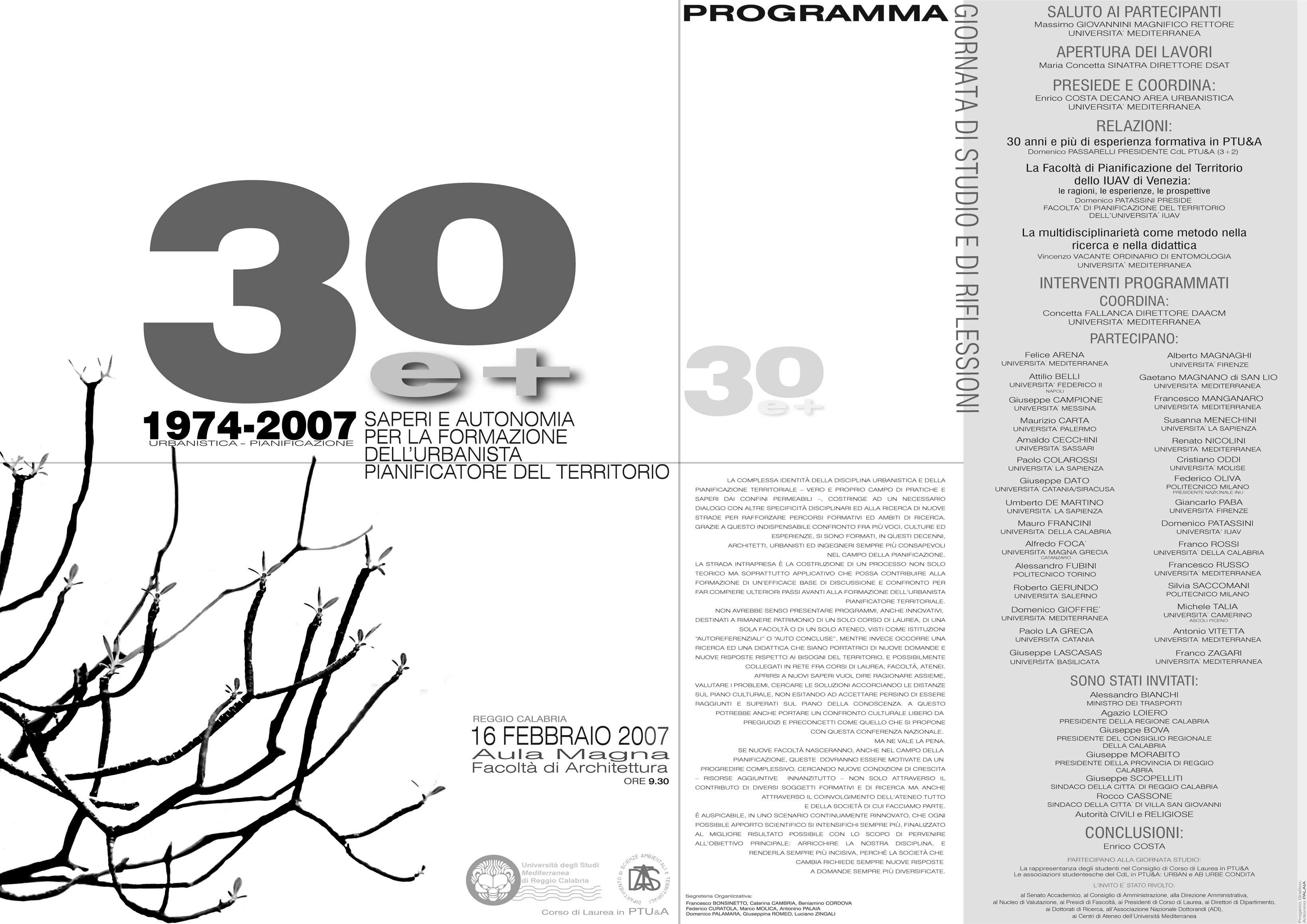 Un bilancio degli oltre trent’anni di attività formativa per la costruzione e l’affermazione a Reggio di una figura professionale specializzata nell’analisi e nella pianificazione territoriale, urbanistica ed ambientale, e la discussione sull’esperienza e sulle prospettive della Facoltà veneziana di “Pianificazione del Territorio” fondata otto anni fa trasformando il preesistente corso di laurea, attivato dal 1971, forniranno ulteriori spunti e stimoli alla Mediterranea per la crescita culturale e l’evoluzione strutturale di uno dei nuclei di eccellenza della nostra Università, avviato nel 1974 con l’istituzione a Reggio Calabria del corso di laurea in Urbanistica.