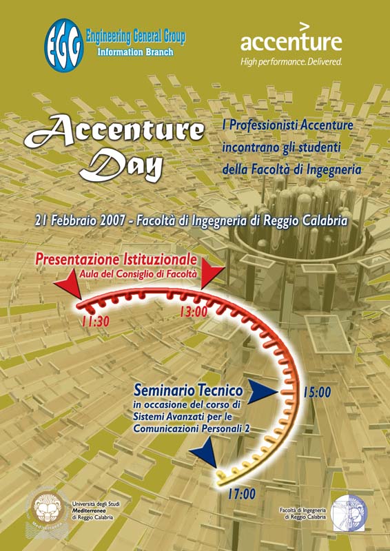 Organizzata dall'associazione studentesca EGG Communication, si terrà mercoledì 21 febbraio presso la facoltà di Ingegneria. La giornata di studio esaminerà le dinamiche del mondo del lavoro attraverso l’esperienza diretta e la presentazione di Accenture, azienda globale di consulenza, servizi tecnologici e outsourcing. L’iniziativa si svilupperà in due sessioni: I ) ore 11:30 – Presentazione di Accenture (aula del Consiglio di facoltà – V piano) II) ore 15:00 – Seminario tecnico in occasione del corso di Sistemi avanzati per le comunicazioni personali II (aula A4 - III piano).