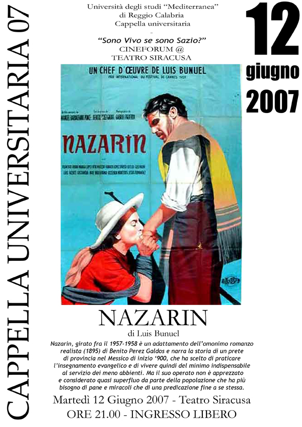 Ultimo appuntamento per Cineforum Cappella Universitaria martedì 12 giugno, ore 21, Cineteatro Siracusa. In proiezione: "Nazarìn", di Luis Bunuel. Ingresso Libero