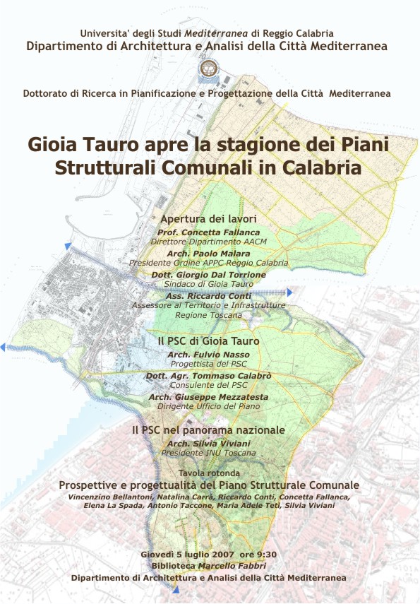 Il 5 luglio 2007, alle ore 9,30, presso la Biblioteca Marcello Fabbri del Dipartimento di Architettura e Analisi della città Mediterranea, si terrà il seminario dal titolo: Gioia Tauro apre la stagione dei PSC in Calabria. L'incontro è promosso dal Dipartimento AACM e dal Dottorato di ricerca in Pianificazione e Progettazione della Città Mediterranea. I lavori saranno aperti dal Direttore, prof. Concetta Fallanca, dal Presidente dell'Ordine provinciale degli APPC di Reggio Calabria, arch. Paolo Malara, dal Sindaco di Gioia Tauro, Dott. Giorgio Dal Torrione e dall'Ass. Riccardo Conti, Assessore al Territorio e Infrastrutture della Regione Toscana. I progettisti e consulenti al PSC, Arch. Fulvio Nasso, Dott. Agr. Tommaso Calabrò e il Dirigente dell'Ufficio di Piano, Arch. Giuseppe Mezzatesta, illustreranno il PSC di Gioia Tauro. L'Arch. Silvia Viviani, Presidente dell'INU Toscana, relazionerà sul PSC nel panorama nazionale. Concluderà i lavori una tavola rotonda sul tema: Prospettive e progettualità del Piano Strutturale Comunale.