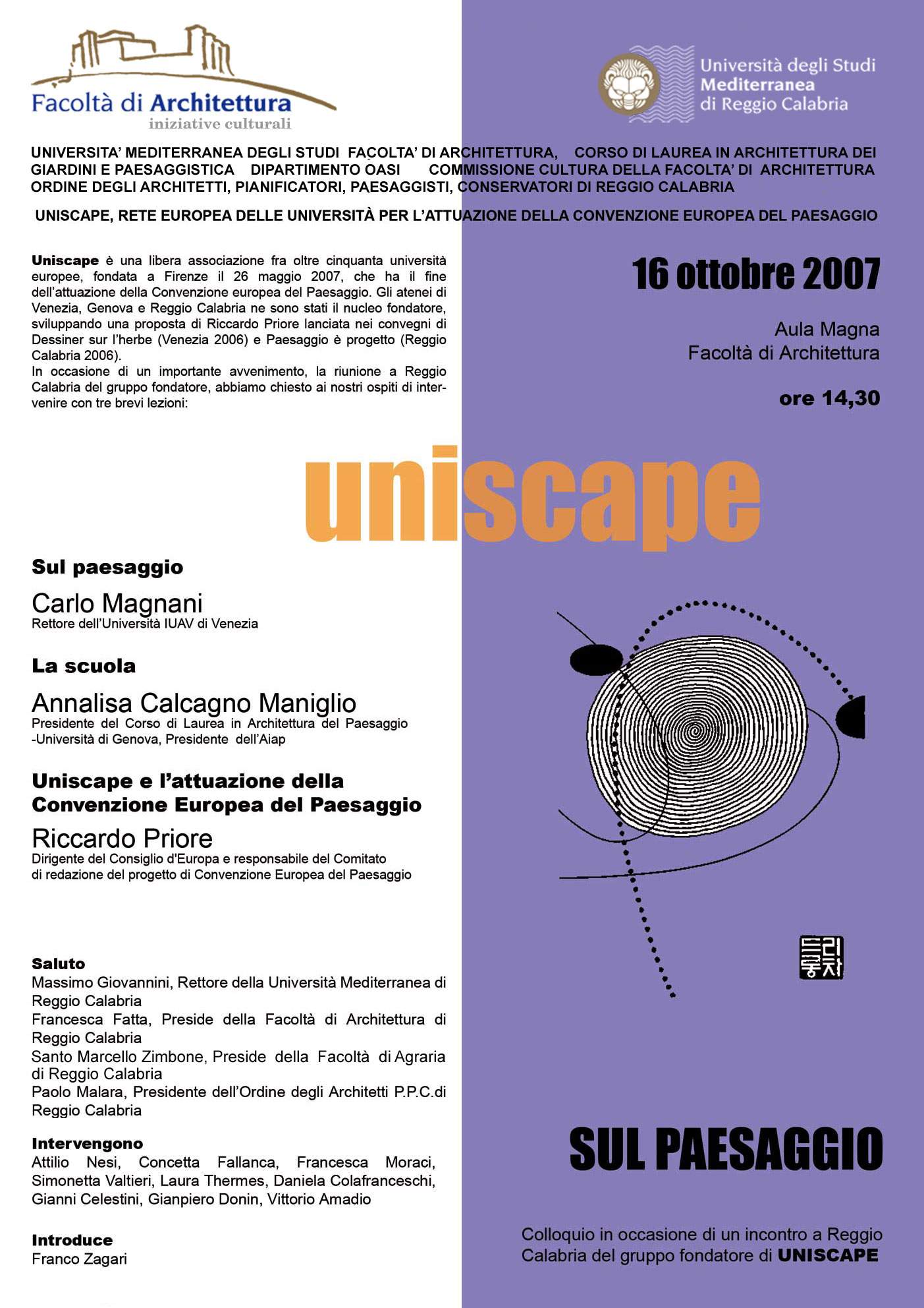 Domani alle 14.30 nell'Aula Magna della Facoltà di Architettura, Carlo Magnani (Rettore IUAV Venezia), Annalisa Calcagno Maniglio (Università di Genova) e Riccardo Priore (Consiglio d'Europa) terranno un colloquio in occasione dell'incontro a Reggio Calabria del gruppo fondatore di Uniscape, la rete europea delle università per l'attuazione della Convenzione Europea del Paesaggio. Il programma avrà inizio con i saluti del Rettore Massimo Giovannini, della Preside Francesca Fatta, del Presidente dell’Ordine degli architetti Paolo Malara. Seguono gli interventi di: Santo Marcello Zimbone, Attilio Nesi, Concetta Fallanca, Francesca Moraci, Simonetta Valtieri, Laura Thermes, Daniela Colafranceschi, Gianni Celestini, Gianpiero Donin, Vittorio Amadio. Il prof. Franco Zagari introduce le tre lezioni. Uniscape è una libera associazione fra oltre cinquanta università europee, fondata a Firenze il 26 maggio 2007, che ha il fine dell’attuazione della Convenzione europea del Paesaggio. Gli atenei di Venezia, Genova e Reggio Calabria ne sono stati il nucleo fondatore, sviluppando una proposta di Riccardo Priore lanciata nei convegni di Dessiner sur l’herbe (Venezia 2006) e Paesaggio è progetto (Reggio Calabria 2006).