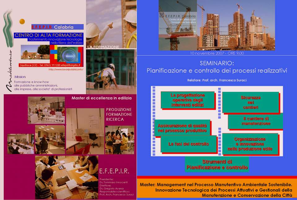 Il seminario tratta degli strumenti di controllo dei processi realizzativi di una opera pubblica e le attività connesse con la progettazione esecutiva, la pianificazione, l'organizzazione e conduzione del cantiere edile, la gestione e valutazione economica dei processi edilizi, la direzione tecnico-amministrativa dei processi di produzione industriale di materiali e componenti per l'edilizia, nonché della manutenzione dei manufatti. Introduce le peculiarità e la funzione della figura del contract manager, tale figura, negli ultimi anni, ha assunto un ruolo di spicco in seno alle grandi e medie imprese di costruzioni edilizie civili o industriali, ed ancora più lo avrà nel futuro per il campo delle opere pubbliche, con lo sviluppo dell'appalto integrato. Particolare trattazione sara’ dedicata al problema, sempre presente del contenzioso nei lavori (claim) in ambito realizzativo ed effettuazione dei controlli, con gli aggiornamenti introdotti dal nuovo Codice dei contratti pubblici (D.Lgs. n. 165/2006) e dalle modifiche al Codice di procedura civile in materia di arbitrato (D.Lgs. n. 40/2006).