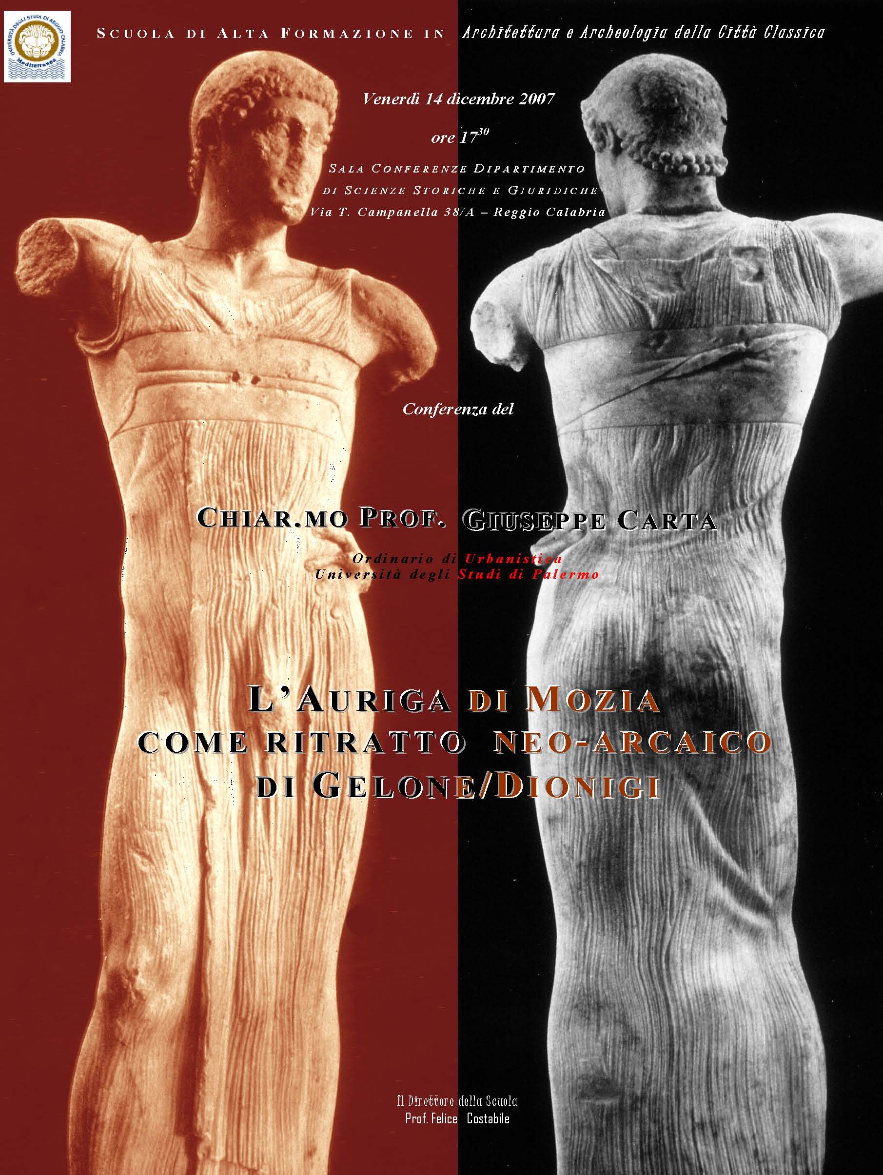 Alle ore 17.00 del 14 dicembre il prof. Giuseppe Carta, ordinario di urbanistica dell'Università di Palermo, terrà la conferenza L'Auriga di Mozia come ritratto neo-arcaico di Gelone/Dionigi. Sala Conferenze del dipartimento di Scienze storiche e giuridiche in via T. Campanella. Programma nel file allegato