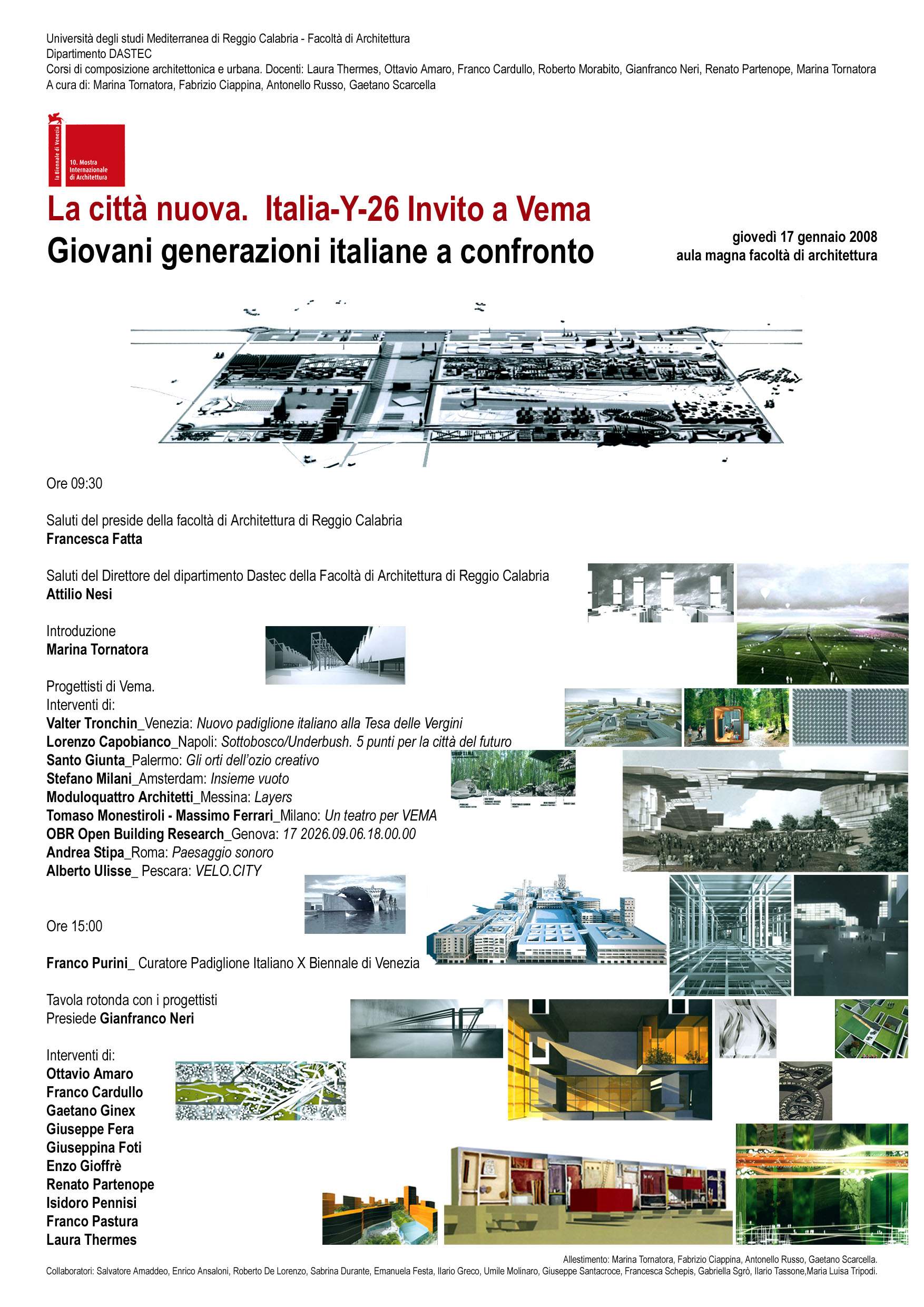 Si inaugura Giovedì 17 gennaio alle 9.30 presso l'Aula Magna Facoltà di Architettura la mostra-convegno "La città nuova Italia -y–26 Invito a Vema Giovani generazioni italiane a confronto" che vedrà il coinvolgimento dei giovani architetti italiani partecipanti alla 10° Mostra Internazionale di architettura - Biennale di Venezia 2006 - padiglione italiano, curatore prof. Franco Purini. A seguire la tavola rotonda in cui interverranno docenti afferenti alle diverse aree disciplinari. Locandina in allegato