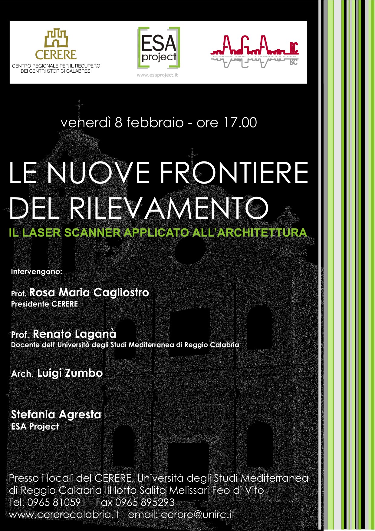 Venerdì 8 febbraio ore 17.00, presso i locali del CERERE lotto III Salita Medlissari Feo di Vito, si terrà l'incontro Le nuove frontiere del rilevamento - Il laser scanner applicato all'architettura. Il programma nel file allegato