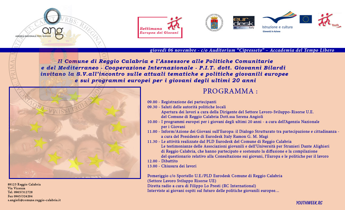 Il Comune di Reggio Calabria, nell'ambito della Settimana Europea dei Giovani 2008, ha organizzato per il 6 novembre una giornata informativa sulle attuali tematiche e politiche giovanili europee e sui programmi europei per i giovani degli ultimi 20 anni. La giornata si articolerà in un incontro/dibattito con la partecipazione di esponenti politici locali nella mattinata e in una diretta radio pomeridiana con il coinvolgimento di Radio RC International. L'evento, patrocinato dall'Agenzia nazionale per i Giovani e dalla Rete Nazionale Eurodesk, ha come obiettivo quello di contribuire, come parte del dialogo strutturato con i giovani, alle discussioni sugli indirizzi futuri delle politiche giovanili europee nonché di valorizzare i programmi europei per i giovani degli ultimi 20 anni. 6 novembre ore 9.00 presso Auditorium Cipresseto. Programma in allegato