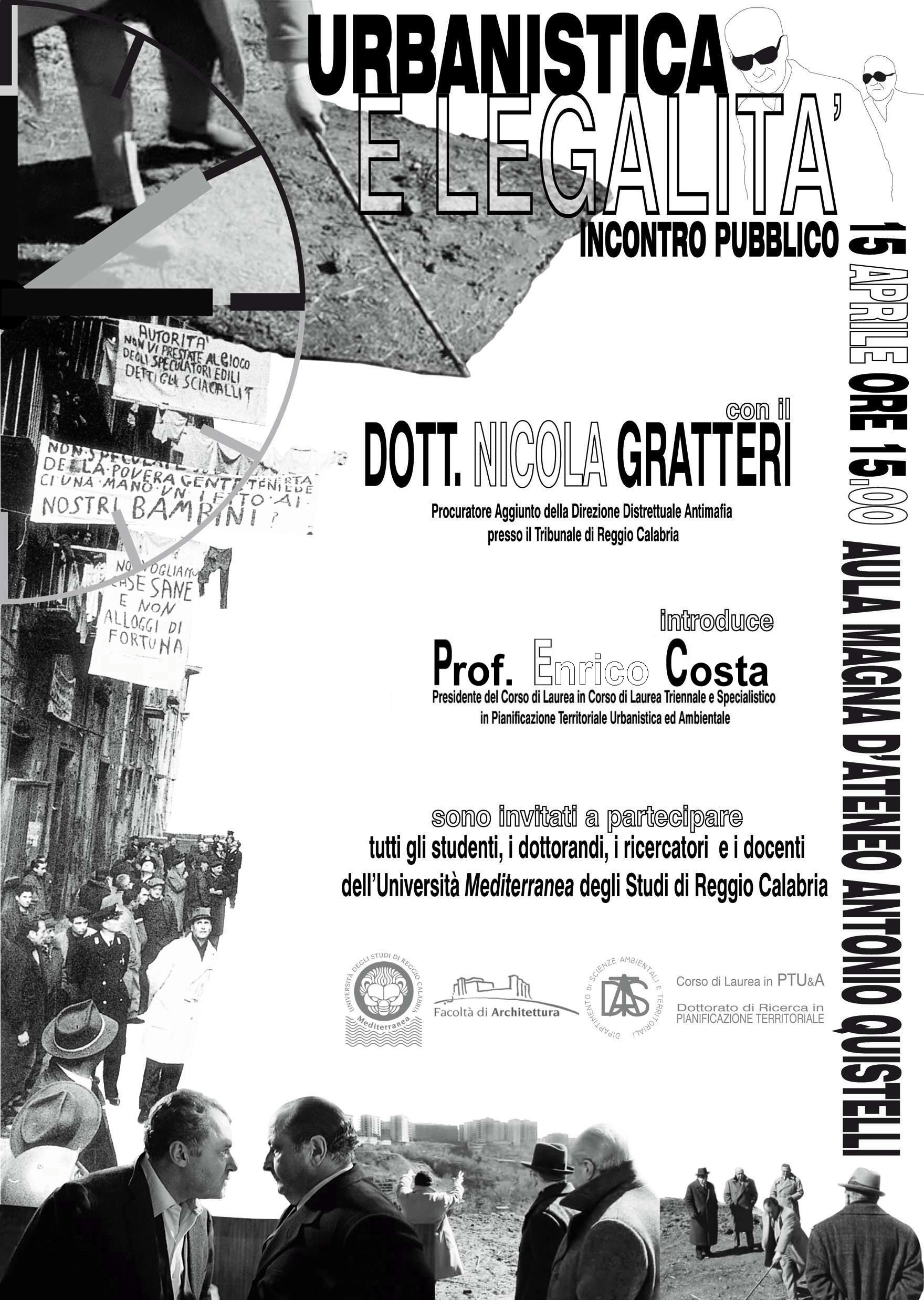 Martedì 14 Aprile 2009 alle ore 11.00, presso la Saletta Tesi, primo piano della Facoltà di Architettura accanto all'Aula Magna, gli organi di informazione sono invitati a partecipare alla Conferenza Stampa di presentazione dell'Incontro sul tema URBANISTICA E LEGALITA' fra il dott. Nicola GRATTERI, Procuratore Aggiunto della Direzione Distrettuale Antimafia presso il Tribunale di Reggio Calabria, e gli studenti ed allievi del Corso di Laurea in PTU&A e del Dottorato di Ricerca in Pianificazione Territoriale, corrispondenti ai tre livelli formativi in “Urbanistica”.