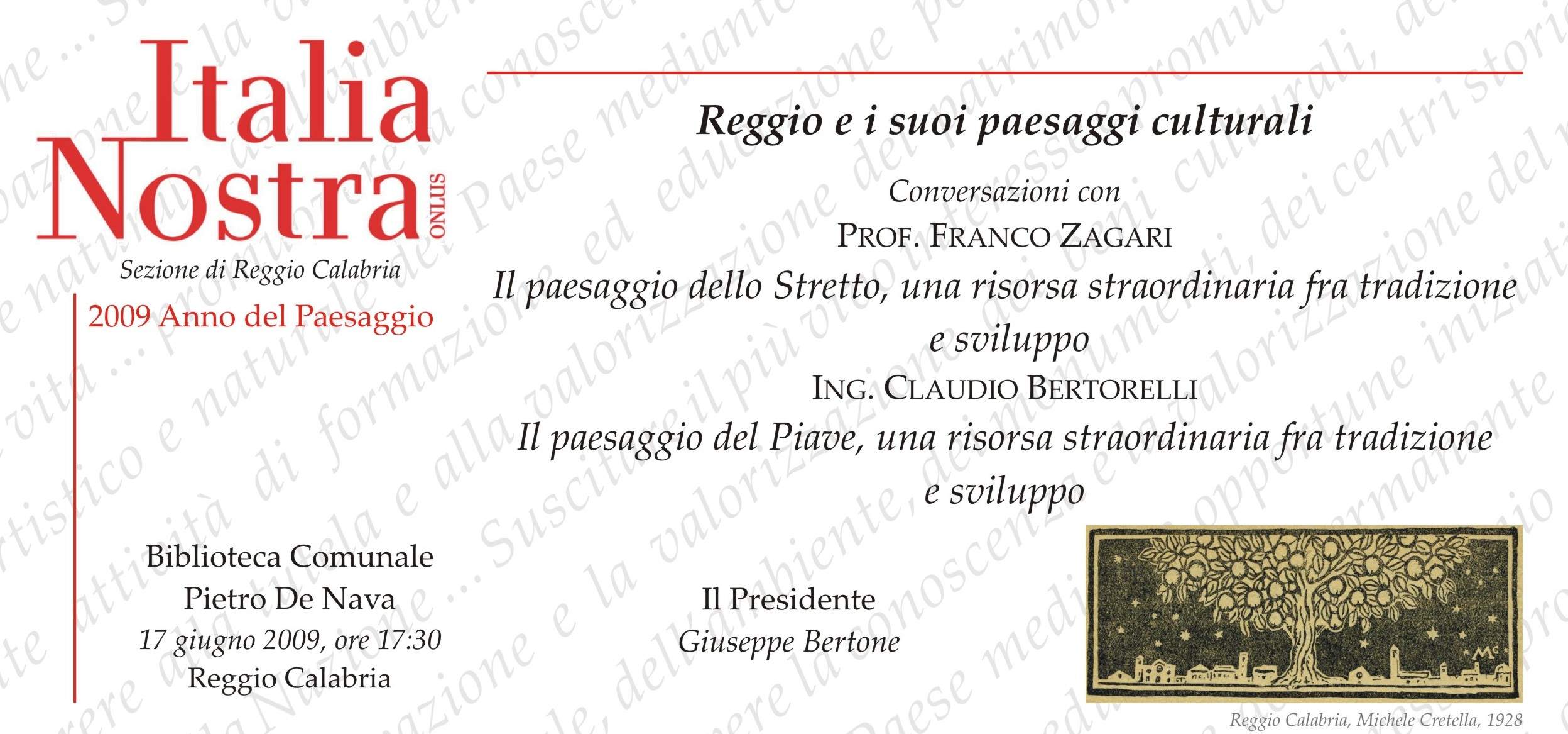 Mercoledì 17 giugno alle ore 17,30 presso la sala conferenze della biblioteca comunale “Pietro De Nava” Il prof. Franco Zagari e l’Ing. Claudio Bertorelli, nella quinta conversazione del calendario del programma “Reggio e i suoi paesaggi culturali” predisposto dalla sezione reggina dell’Associazione Italia Nostra onlus, per il 2009, tracciano un quadro parallelo su due paesaggi italiani molto diversi ma con curiose affinità, risorse straordinarie fra tradizione e sviluppo. In particolare il prof. Franco Zagari espone le sue tesi sul paesaggio dello Stretto, informa di una ricerca nazionale sui PAESAGGI DEL RIFIUTO (Prin) e del contributo del gruppo di paesaggio della Mediterranea di Reggo Calabria, documentato da un piccolo libro (I paesaggi del no. Un progetto per lo Stretto, iiriti editore 2009), avanza una proposta su un parco naturale dello Stretto, chiede l’aiuto di Italia Nostra. Proprio per la consapevolezza del paesaggio come un valore comune alle diverse culture e tradizioni è forse il momento più suscettibile di creare un movimento di opinione, un volano che anticipi, stimoli e favorisca un’evoluzione amministrativa e politica in questo senso. Mentre l’Ing. Claudio Bertorelli racconta una ricerca svolta per L’Aato Veneto Orientale sul paesaggio del Delta del Piave (con Franco Zagari, fotografie di Maria Rosa Russo, ricerca di base Lisa Zillio). Un viaggio attraverso i paesaggi della pianura del Piave ci rivela un patrimonio di inestimabile valore quanto fragile. La sezione reggina di Italia Nostra presieduta dall’arch. Giuseppe Bertone, coadiuvato dai soci del comitato tecnico organizzativo Rossella Agostino, Francesco Arillotta, Laura Battaglia, Maria Rosaria Fascì, Alberto Gioffrè, Angela Martino ed Eleonora Uccellini intende, attraverso il ciclo di conversazioni su “Reggio e i suoi paesaggi culturali”, trasferire, a livello locale , la scelta fatta dall’associazione a livello nazionale, di celebrare il 60° anniversario dalla nascita della Costituzione che, all’art. 9, sancisce “la tutela del paesaggio e del patrimonio storico artistico della nazione”. L’approfondimento sui temi legati al Paesaggio proposto la sezione reggina di Italia Nostra è iniziato nel 2008 con la campagna nazionale “Paesaggi sensibili” che l’ ha vista promotrice del convegno “Tra Scilla e Cariddi: il paesaggio dello Stretto”, svoltosi nel settembre scorso svoltosi a bordo di una nave delle FS. Italia Nostra pone con forza l’accento sul paesaggio urbano, rurale e naturale per suscitare l’interesse e promuovere azioni utili alla sua tutela. Nelle precedenti conversazioni si è discusso di “recupero dell’edilizia abusiva” .con l’arch. Alberto Gioffrè , di “paesaggi dell’anima” con la dott.ssa Maria Maddalena Sica, di “Archeologia e quotidianità della vita” con la dott.ssa Rossella Agostino e della “storia urbanistica della città di Reggio Calabria” con lo storico Franco Arillotta. Nel prossimo incontro del 23 settembre si tornerà a discutere con la prof. Francesca Martorano di “Reggio e il suo passato. La promozione e la valorizzazione dei siti archeologici”. Invito allegato
