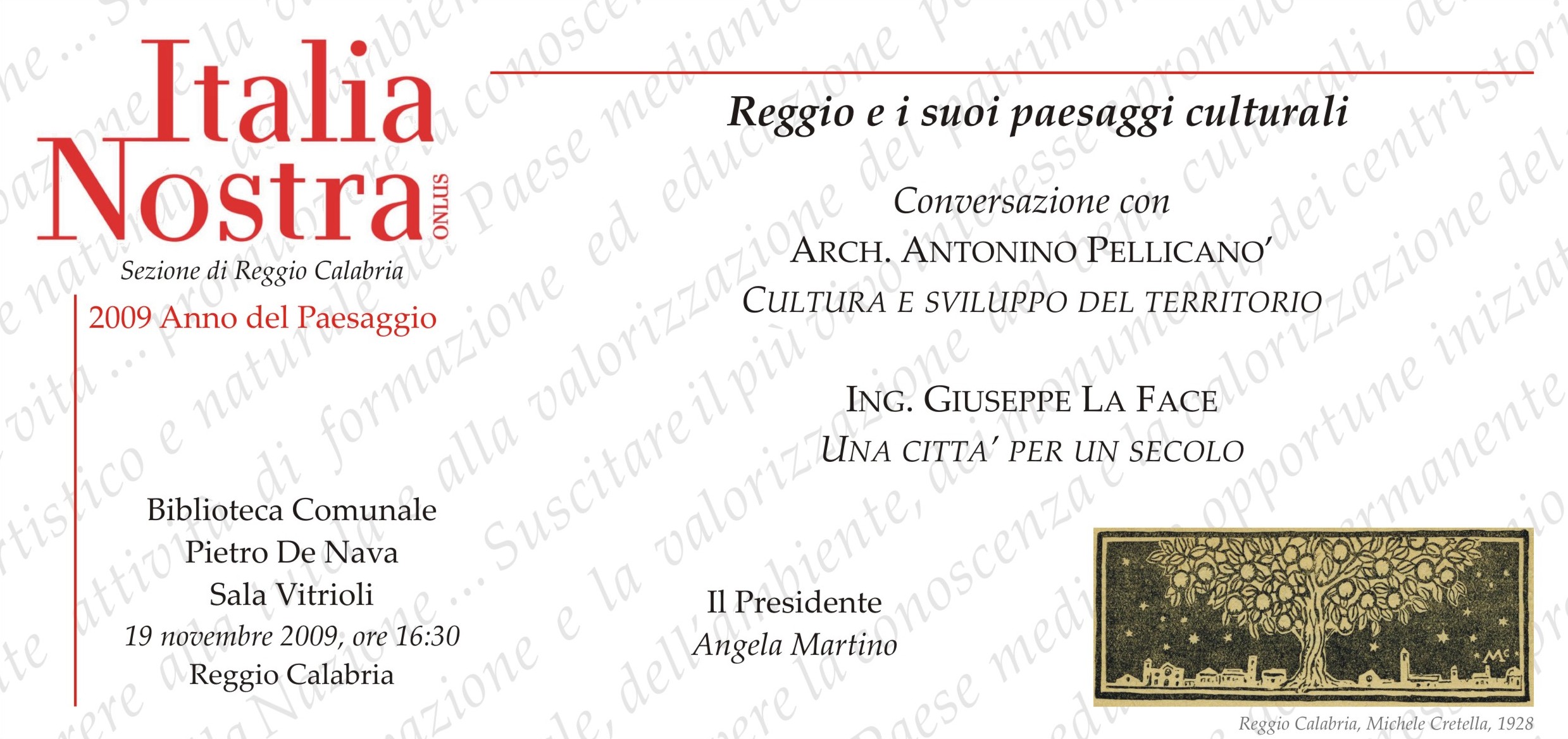 La sezione reggina di Italia Nostra presieduta dalla Prof.ssa Angela Martino, coadiuvata dai soci del comitato tecnico organizzativo Rossella Agostino, Francesco Arillotta, Laura Battaglia, Giuseppe Bertone, Maria Rosaria Fascì, Alberto Gioffrè ed Eleonora Uccellini ha inteso, quest’anno, attraverso il ciclo di conversazioni su “Reggio e i suoi paesaggi culturali”, trasferire, a livello locale, la scelta fatta dall’associazione a livello nazionale, di celebrare il 60° anniversario dalla nascita della Costituzione proponendo una attenta riflessione sull’art. 9 che sancisce “la tutela del paesaggio e del patrimonio storico artistico della nazione”.