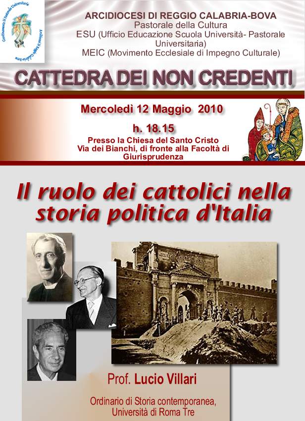 Nell’ambito delle attività della “Cattedra dei non credenti” promossa anche dalla Pastorale universitaria dell’Arcidiocesi reggina, oggi mercoledì 12 maggio alle ore 18.15, presso la Chiesa del Santo Cristo - Via dei Bianchi, di fronte la Facoltà di Giurisprudenza - parlerà l’autorevole Prof. Lucio Villari, ordinario di Storia contemporanea all’Università di Roma Tre sul tema: Il ruolo dei cattolici nella storia politica d’Italia. Partecipazione libera. In allegato la locandina.