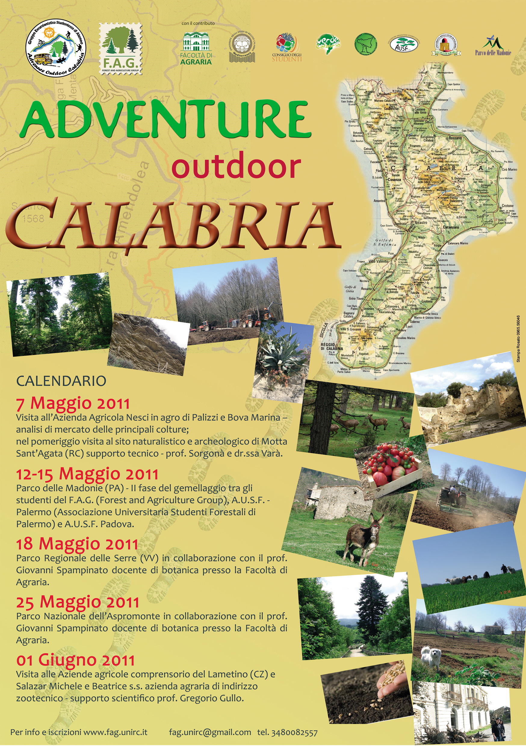 Si informano tutti gli studenti che è stato avviato il Gruppo Escursionistico Studentesco di Ateneo – G.E.S.A., il quale ha previsto per il mese di Maggio ben 5 uscite! Inoltre si porta a conoscenza tutti coloro che sono interessati a prendere parte alle attività, che dal 2 Maggio 2011 sono aperte le adesioni. Per informazioni sulle attività visitate l’home page dell’Associazione F.A.G al link sottoindicato. Info orari e costi nella sezione “modulistica”. Comitato Scientifico prof. Francesco Saverio Nesci prof. Giovanni Spampinato prof. Giuseppe Bombino prof. Gregorio Gullo dr. Alfonso Picone Chiodo dr.ssa Valeria Varà prof. Agostino Sorgonà prof. Orlando Sorgonà Il Presidente F.A.G. dr. Adriano Ganino