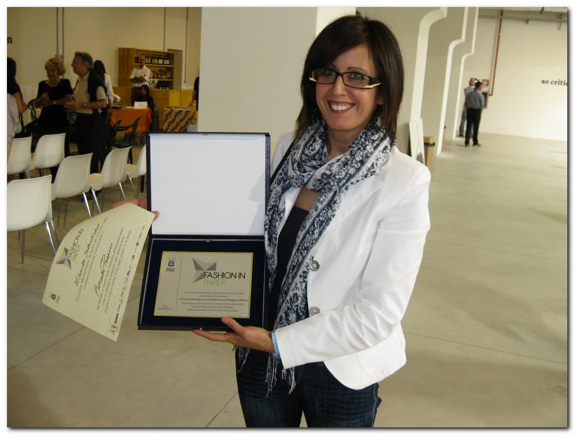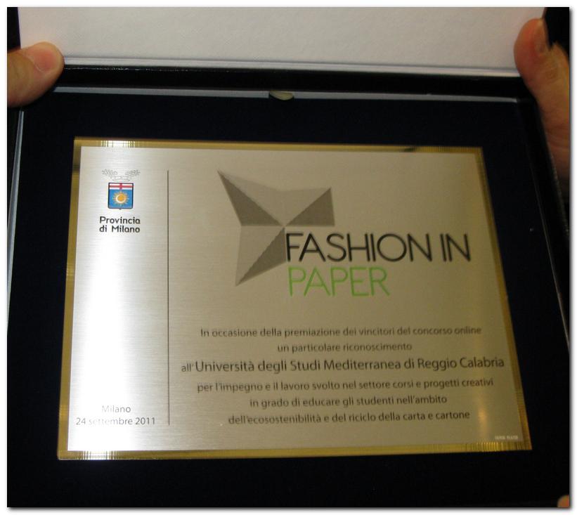 Sabato 24 settembre presso i Frigoriferi Milanesi, all'interno di "So Critical So Fashion” evento sulla moda critica, etica e indipendente l’arch. Antonella Pezzano a nome della Facoltà di Architettura della Mediterranea, si è aggiudicata il sesto posto con il girocollo "Antica traccia" nel concorso online “Votami” messo in campo nell’ambito della mostra “Fashion In Paper”, che sostiene la ricerca espressiva di moda, design e fashion con materiali inusuali e alternativi.