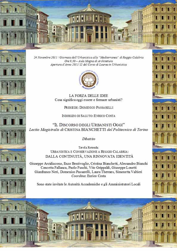 Giovedì 24 Novembre 2011, presso l’Aula Magna di Architettura, puntualmente anche per l’Anno Accademico 2011/12, il Corso di Laurea in “Urbanistica” della “Mediterranea” di Reggio Calabria organizza l’Ad’A – Apertura d’Anno –, una giornata di dibattito sullo stato della disciplina e della formazione dell’Urbanista.